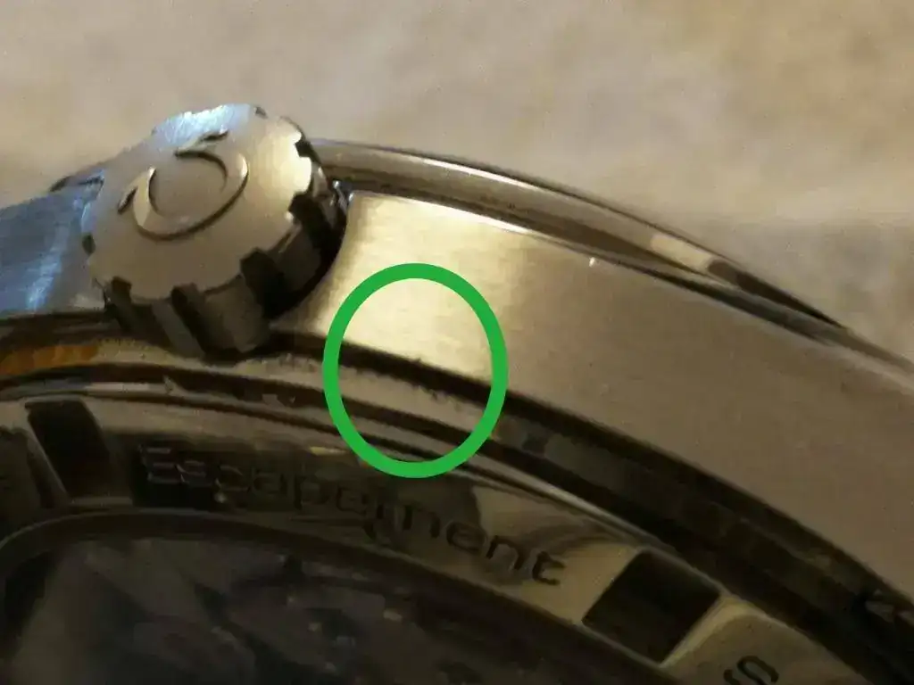 El reloj está en muy muy buen estado. No he sido su primer propietario pero cuando lo compré hice que le hicieran un pulido muy ligero que lo dejó estéticamente casi perfecto. Digo casi porque el reloj tiene al lado de la corona un toquecito minúsculo, de esos que hay que pasar el dedo o la uña para notar que está ahí. Preferí que el reloj mantuviera su forma original a ir más allá con el pulido para eliminar ese minúsculo golpe. En una de las fotos lo resalto con una foto macro y un circulo verde, pero como ya digo... hay que acercarse mucho para verlo.