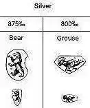 En torno a 1882 comienza a usarse la figura del urogallo para la plata de 800 milésimas, al principio pequeño e insertado en un óvalo, y una década después aparecen dos punzones, la misma ave pero estampada a mayor tamaño y de manera más vistosa dentro de un pentágono y un oso erguido para el valor de 875 milésimas.