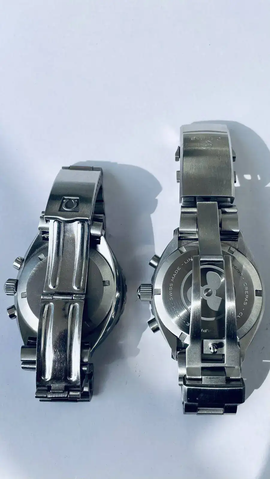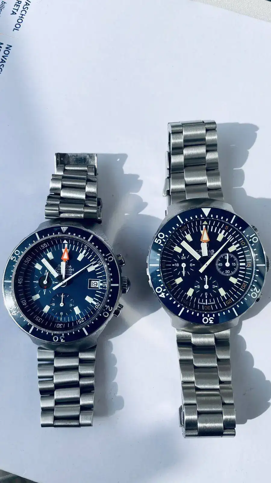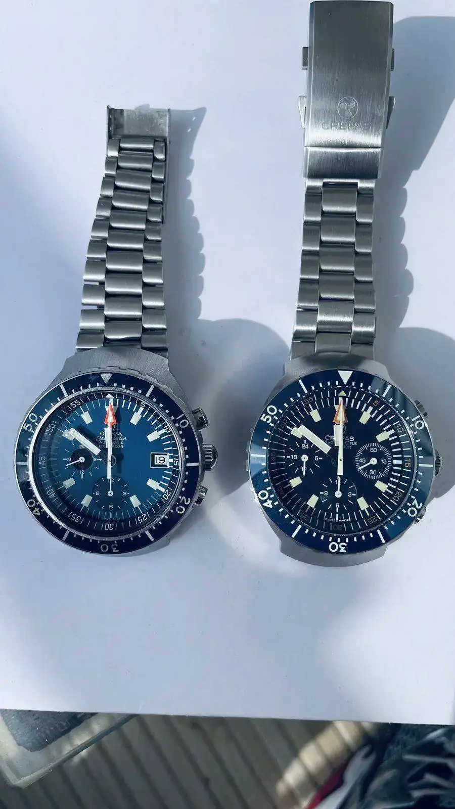Comentaros que al Big Blue le he puesto dial y agujas nuevas , todavía hay stock en Omega, por supuesto todo lo original guardado, deciros que el calibre del Crepas aunque cuando llegaron tuvieron un problemilla de reseteo que a Crepas lo arreglo rápidamente , era una tontería , los pulsadores son realmente agradables al tacto y mantiene una marcha espectacular, a mi entender el Crepas da la impresión de ser más grande y pesa bastante más , pero ambos son una verdadera preciosidad , estoy más que encantado con ellos.