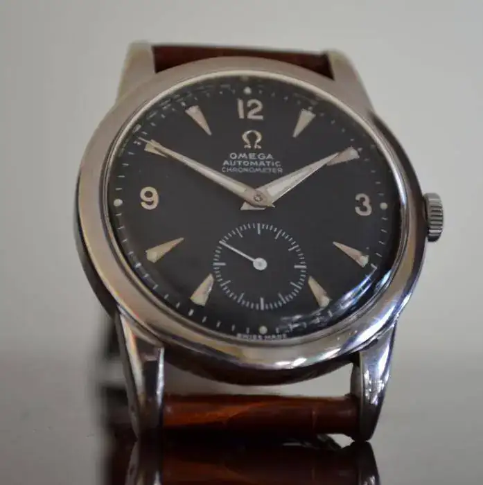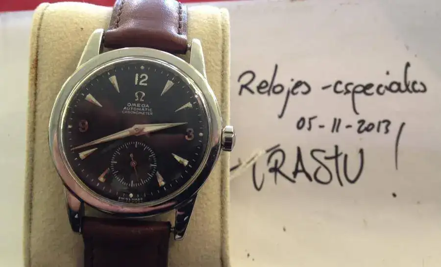 tercer y último reloj que saco a la venta este mes, un Omega Chronomètre esfera negra con el mítico calibre 343 RG, serie limitada a 5000 piezas. Cómo se puede apreciar la esfera está restaurada, aunque está muy bien restaurada, solo con algunos defectos que se aprecian en las fotos de presentación en la parte de arriba entre las 10 y las 12. Caja de acero de 32mm, 35mm con corona (marcada Omega). El calibre acaba de ser revisado por un ilustre relojero compañero del foro, y va a las mil maravillas. Os dejo la foto de nick y el enlace de presentación del reloj.