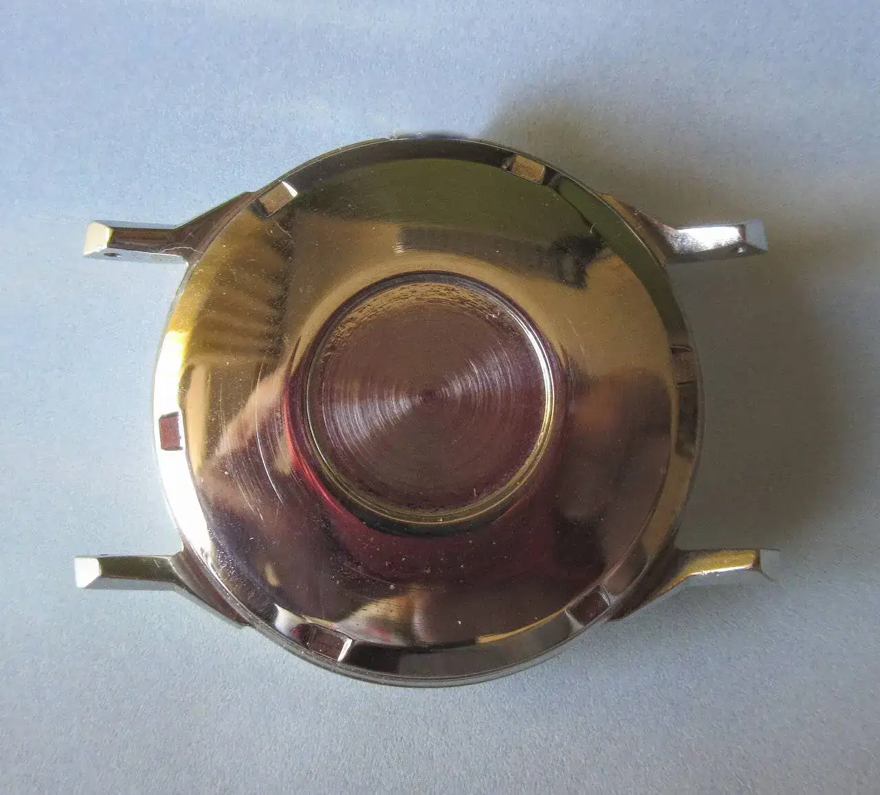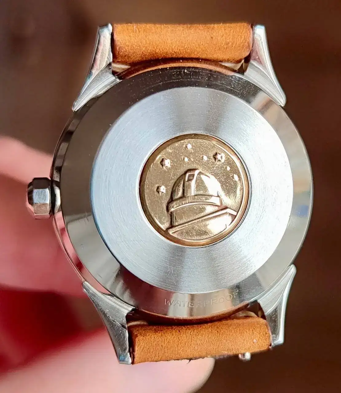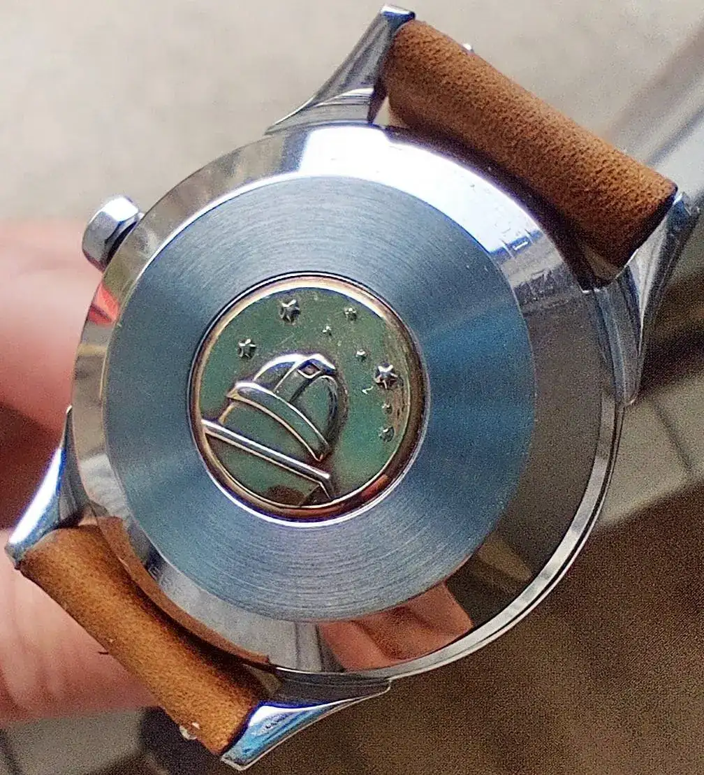 La parte posterior de la caja es muy característica de los Omega Constellation de la época, y muestra, en relieve, la imagen del Observatorio astronómico de Ginebra, rodeado de ocho estrellas, que simbolizan los concursos de precisión ganados por Omega. Como comentaba con anterioridad, este grabado es dorado, al igual que los índices y agujas, en contraste con la caja de acero.