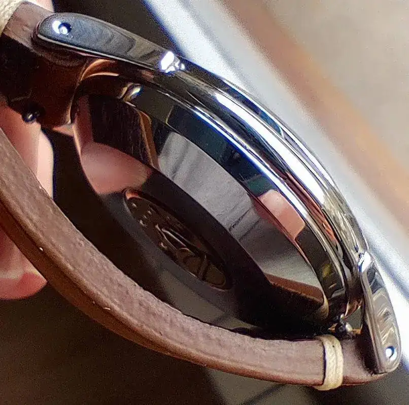 Uno de los aspectos que más me gusta de la esfera es cómo varía en función de la incidencia de la luz sobre los índices, agujas y apliques dorados, algo que he intentado reflejar, con menos éxito del deseado, en las siguientes fotos:
