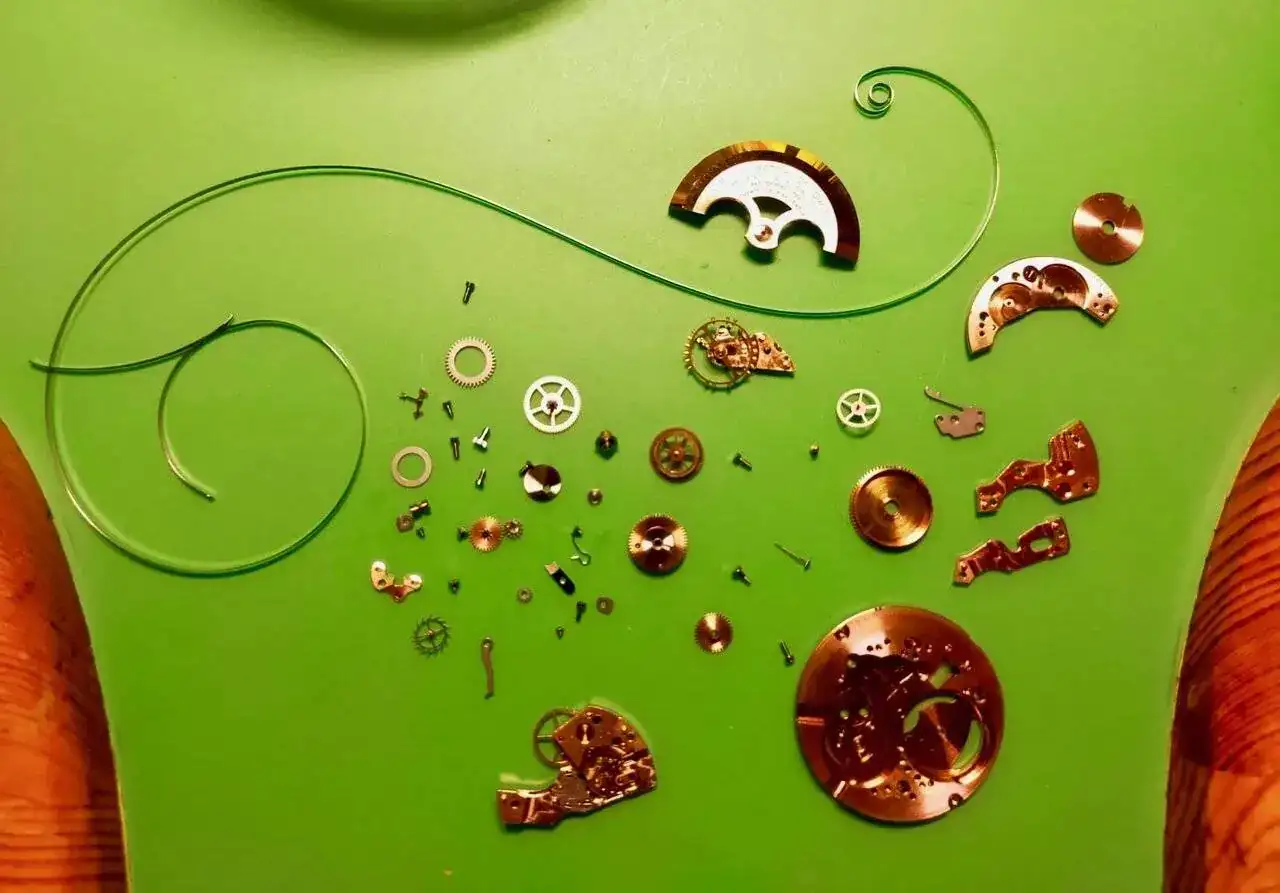A continuación, una foto del movimiento desmontado con todas sus piezas, como parte del proceso de mantenimiento realizado por mi relojero: