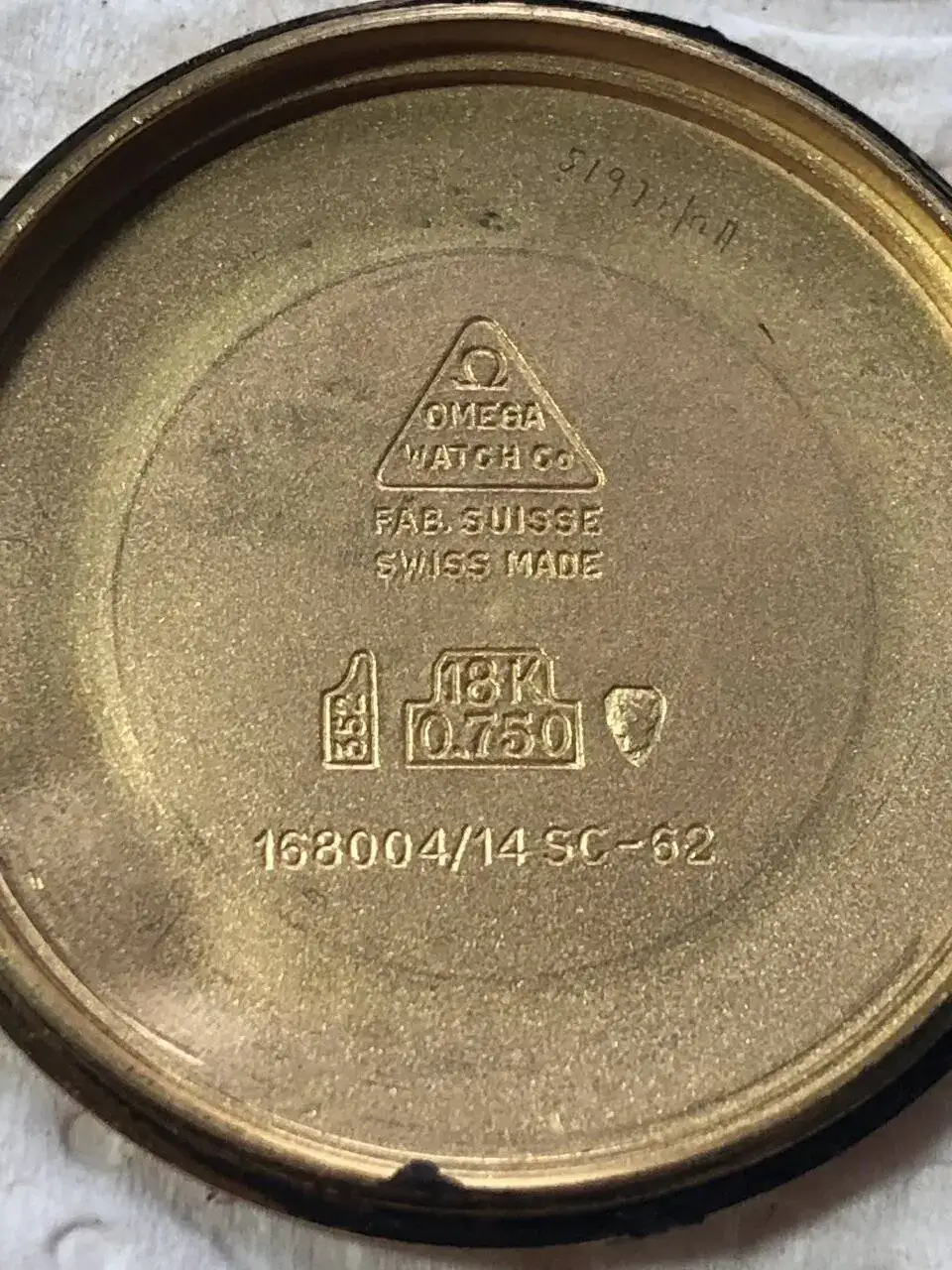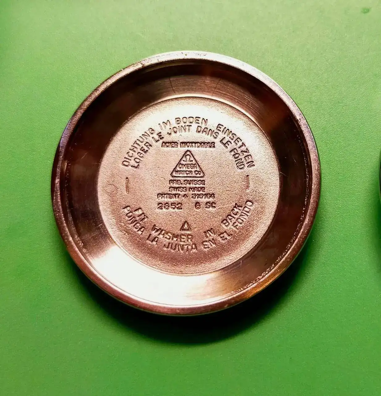 La parte interior de la tapa posterior lleva grabado el texto "OMEGA WATCH CO", junto al logo, dentro de un triángulo, "ACIER INOXIDABLE", "FAB SUISSE", "SUISSE MADE", "PATENT 315164" y el modelo "2852 8 SC", además de la indicación "PONGA LA JUNTA EN EL FONDO" en cuatro idiomas: Alemán, Francés, Inglés y Español.