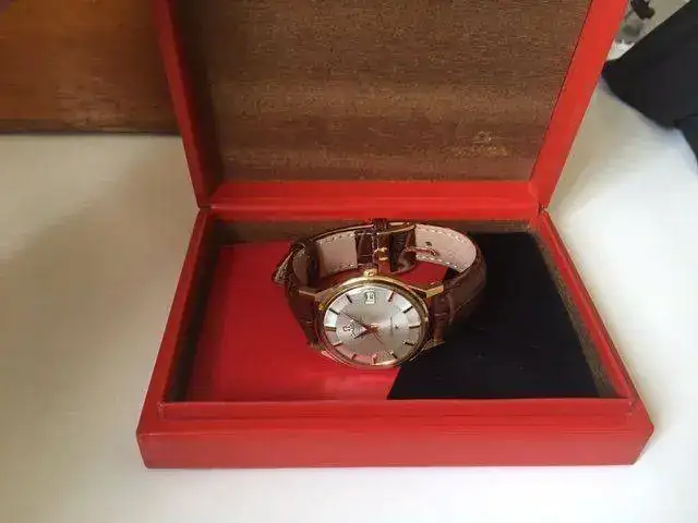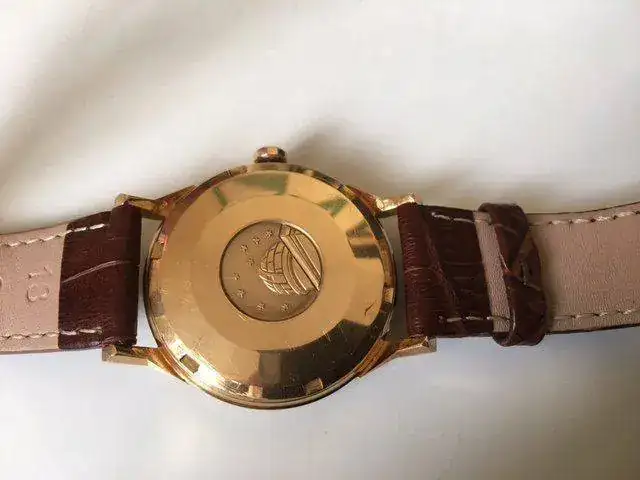 Trae una correa de piel marrón y bucle Omega oro macizo 18 kilates, además de caja Omega de la época.