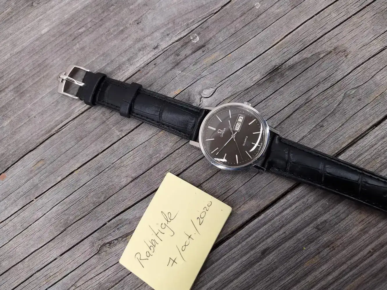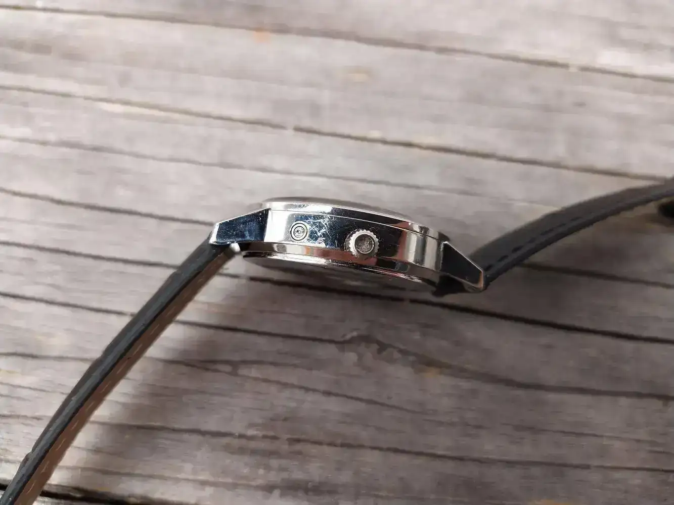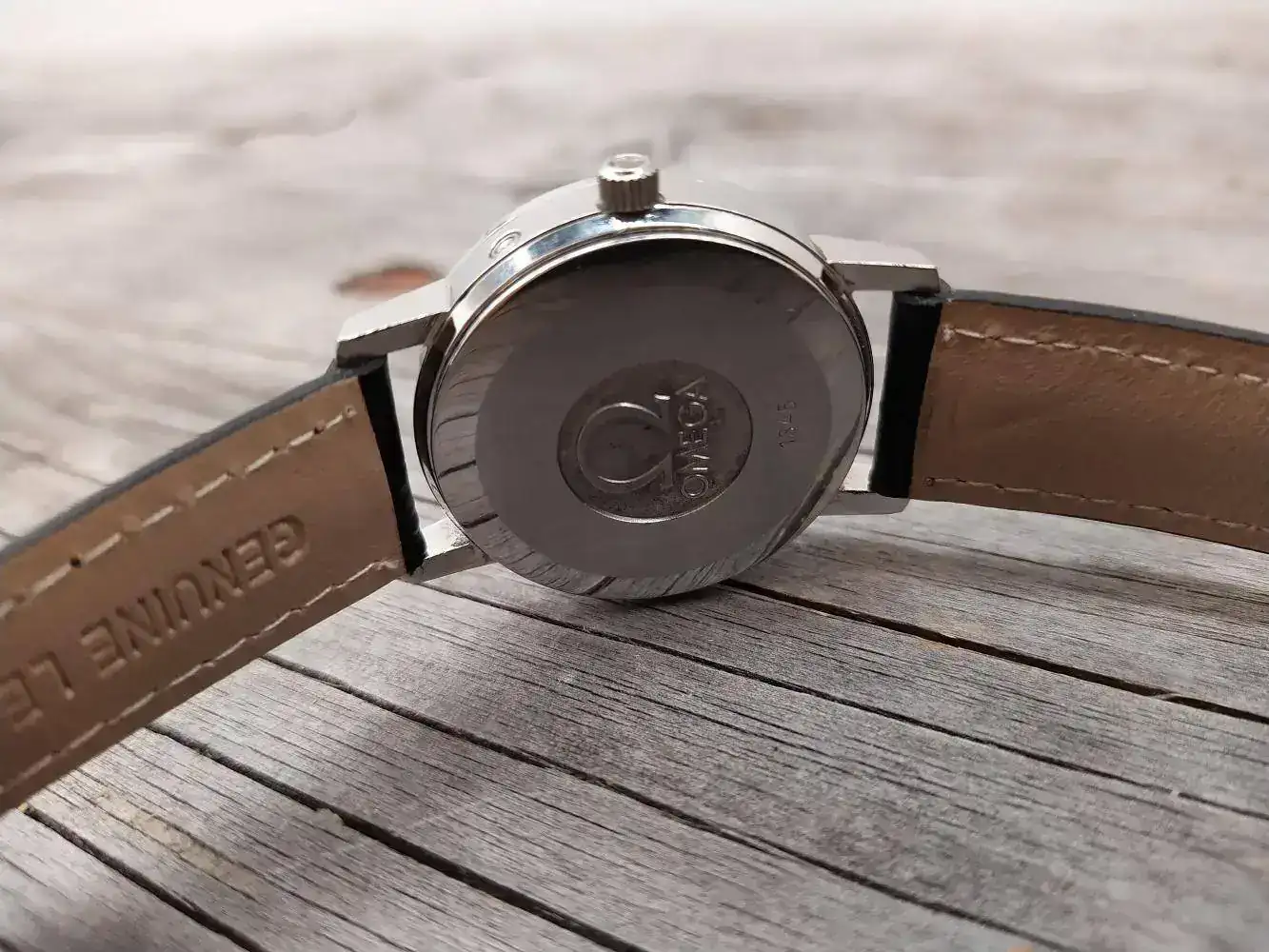 (Cosas del calibre 1345 de Omega), y es pequeño para mi.Los puntitos blancos que se aprecian en la esfera no son reflejos en el plexi (original Omega, por cierto, con su logo grabado en el centro), sino que están realmente en la esfera.