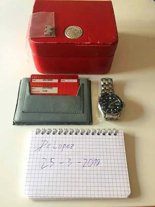 El reloj va completo de dotación: cuenta con su caja tipo "bombonera roja" original de Omega (aunque presenta desgaste), la tarjeta de garantía, tarjeta de pictogramas y manuales.