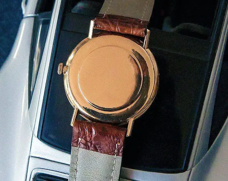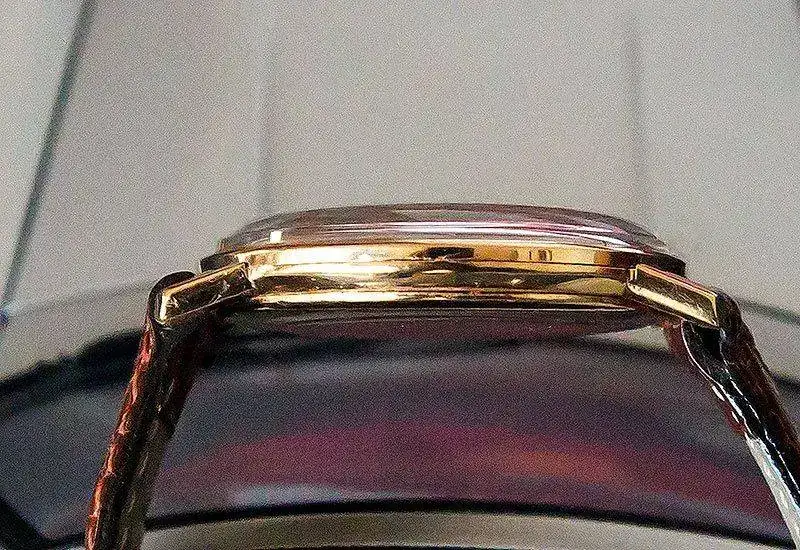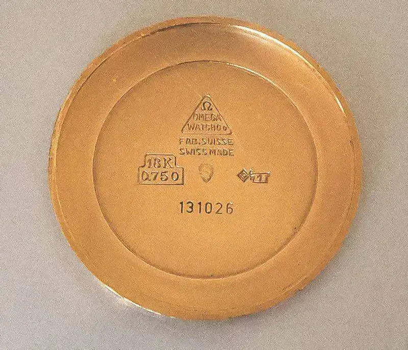 Caja de oro 750, 18k, de diámetro 33 mm. excluida corona. No tiene golpes ni rayas profundas pero se ha tener en cuenta que los años siempre dejan huella del uso. Pero nunca se me ocurrió pulirlo. Es original. La corona también es la original pero no lleva marcado el logo de Omega.
