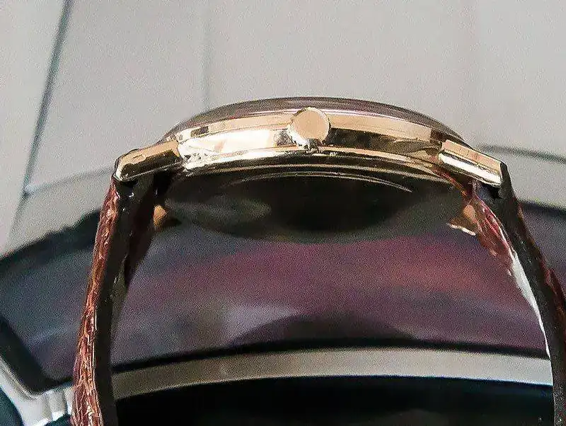 Esfera original sin restaurar color blanco champán casi perfecta, digo casi porque nueva no es, pero mirada con lupa no se le ven imperfecciones de humedad u otras. Agujas de oro bastante bien conservadas. La tapa es de plástico abombado, enmarcada en oro, que se conserva perfectamente con las habituales rayas, y pequeños roces, ninguno de ellos profundos. Un simple pulido la deja nueva. Yo he preferido no tocarla.