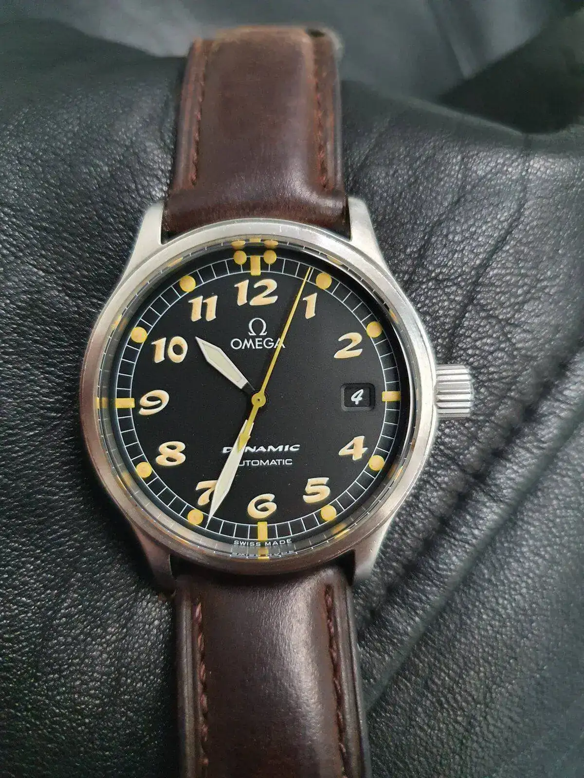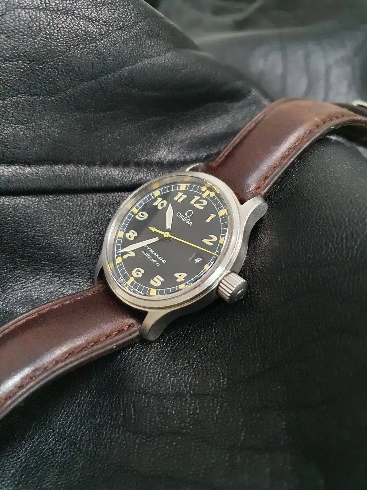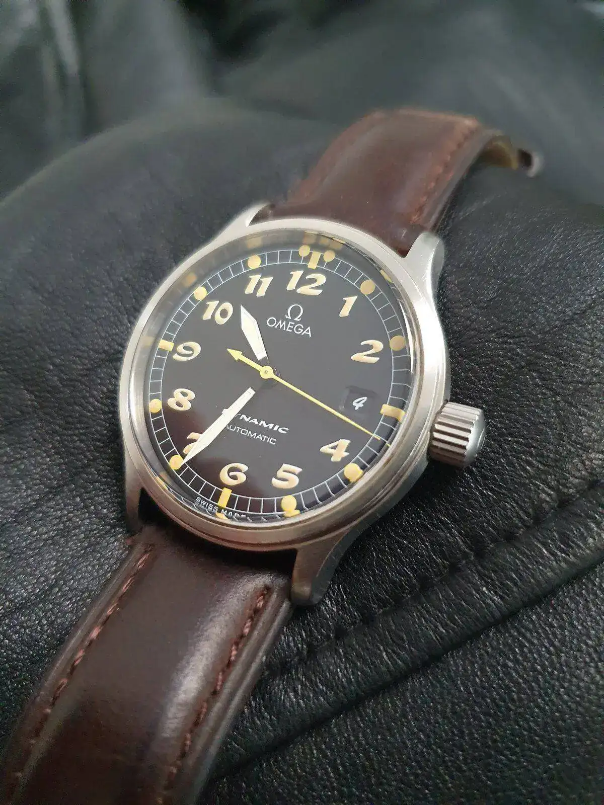 Tras mucho pensármelo, saco a la venta un reloj muy especial y cada vez más difícil de encontrar. La última generación que Omega lanzó de su gama Dynamic, un homenaje a los relojes que la marca fabricó para la RAF durante la II Guerra Mundial. Esta unidad se trata de una de las primeras, ya que tiene los números y de tritio (luego se sustituyeron por superluminova blanca), lo que le da un aspecto mucho más fiel a los RAF originales, como este: https://www.analogshift.com/products/omega-raf-53-thin-arrow. Su tritio amarillo tostado intenso precioso en numerales e índices aún mantiene la luminosidad.