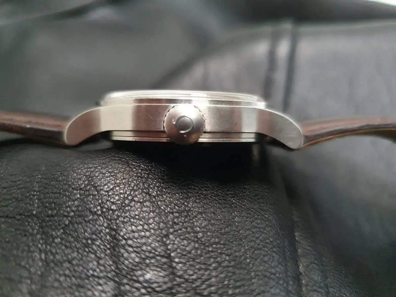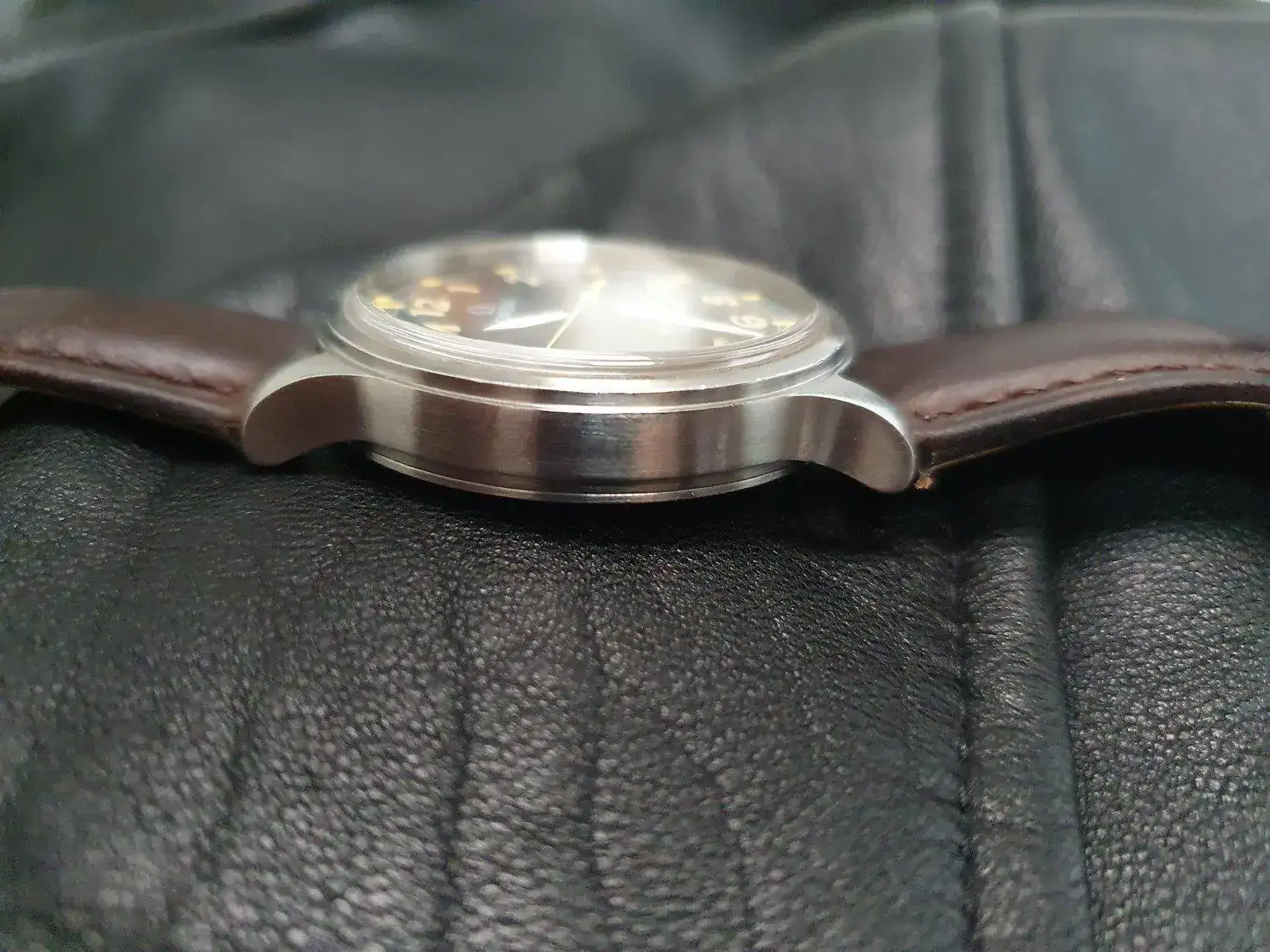 La caja, con sus 36,5mm, su gran corona roscada y su fondo roscado aseguran (en teoría, yo no lo haría sin cambiarle las juntas) 50 metros de estanqueidad, lo que lo convierte en una especie de Flieger-Field watch que, con una nato, puede llegar al fin del mundo. La caja tiene los rayajos propios de un reloj de casi 30 años, pero no tiene golpes en las aristas y, aquel que lo quiera pulir, si lo lleva a un buen sitio, se lo dejarán nuevo. Tiene cristal de zafiro plano con antirreflejos interior (con una raya apenas apreciable; solo se ve al trasluz y con lupa) que sobresale de la caja con los bordes redondeados, como un plexi.