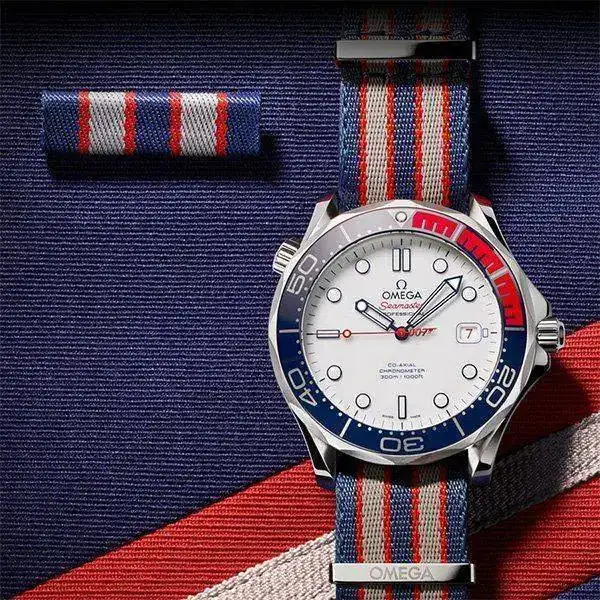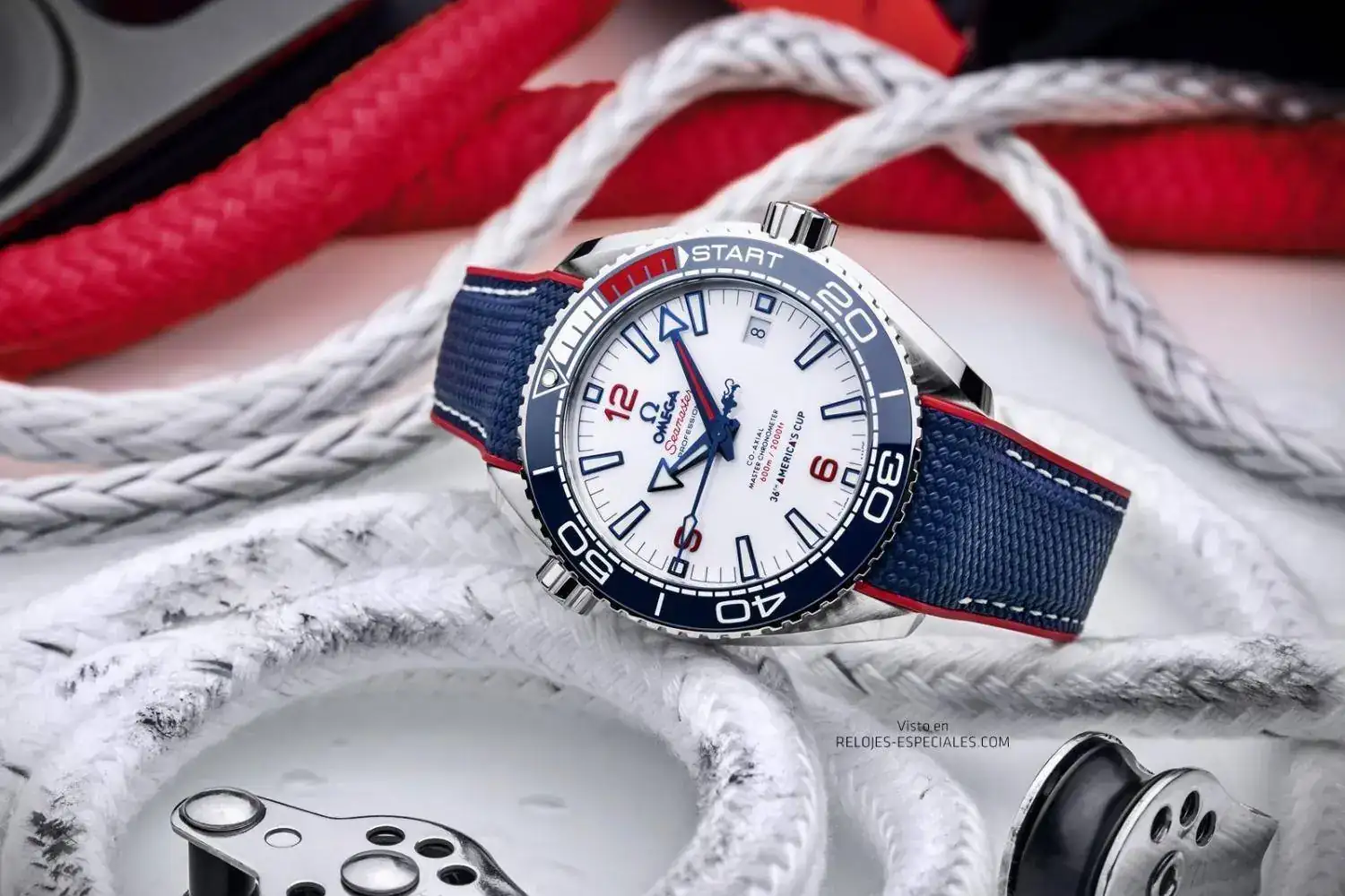 Con este anuncio OMEGA lanza el nuevo Seamaster Planet Ocean 36th America's Cup Edición Limitada. Presentado con una pulsera de caucho estructurado, el reloj, de 43,50 mm, está realizado en acero y se limita a solo 2.021 ejemplares. Se destaca el bisel de inmersión en cerámica azul, que incorpora cerámica líquida blanca y roja, con el fin de crear una cuenta atrás de 5 minutos para las regatas.