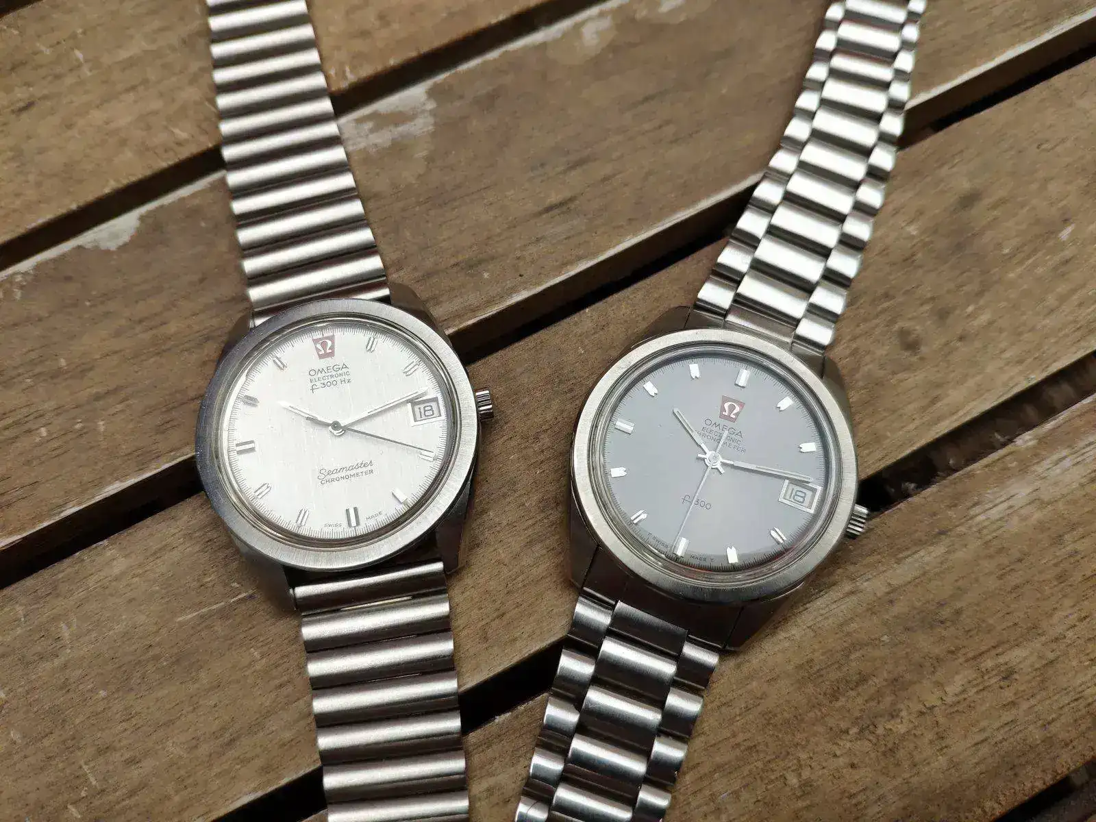 - Inicialmente la referencia interior es 198.0001, la tapa trasera no lleva emblema alguno y las esferas son blanca/plata o gris, teniendo ambas un bonito cepillado vertical, logo de Omega sustituyendo las 12 o debajo de ellas y leyenda “OMEGA ELECTRONIC f 300 Hz” en la parte superior y “Seamaster Chronometer” en la inferior. Las agujas son de bastón.