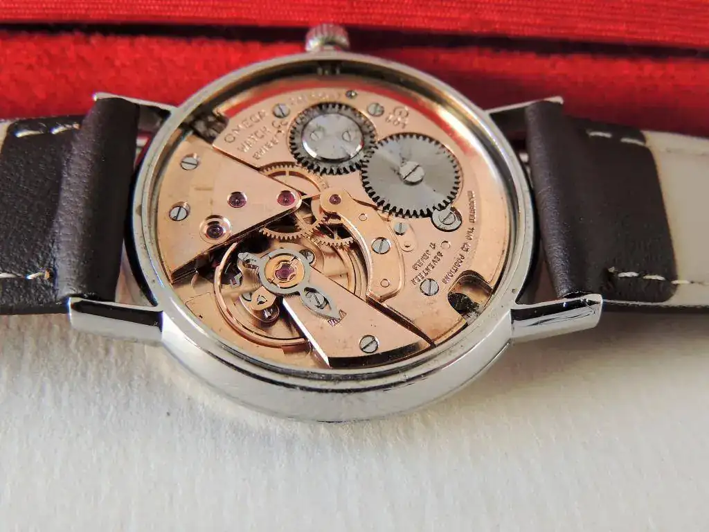 Lleva un calibre manual 601 de 17 rubís, un clásico de Omega, y funciona y carga sin problemas ya que está revisado y engrasado hace menos de un año.