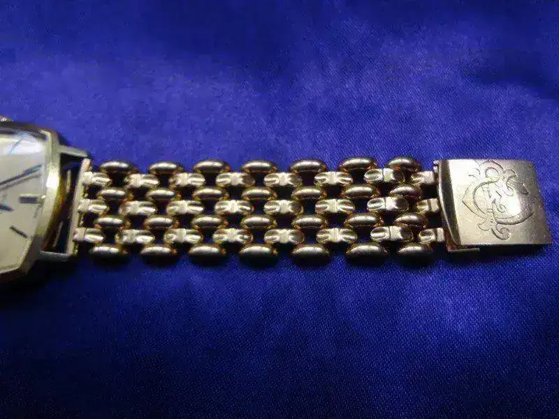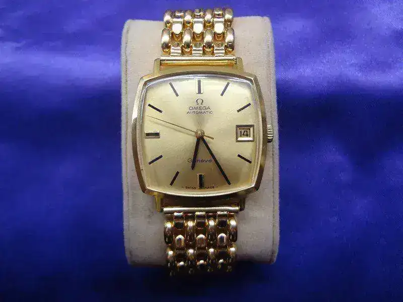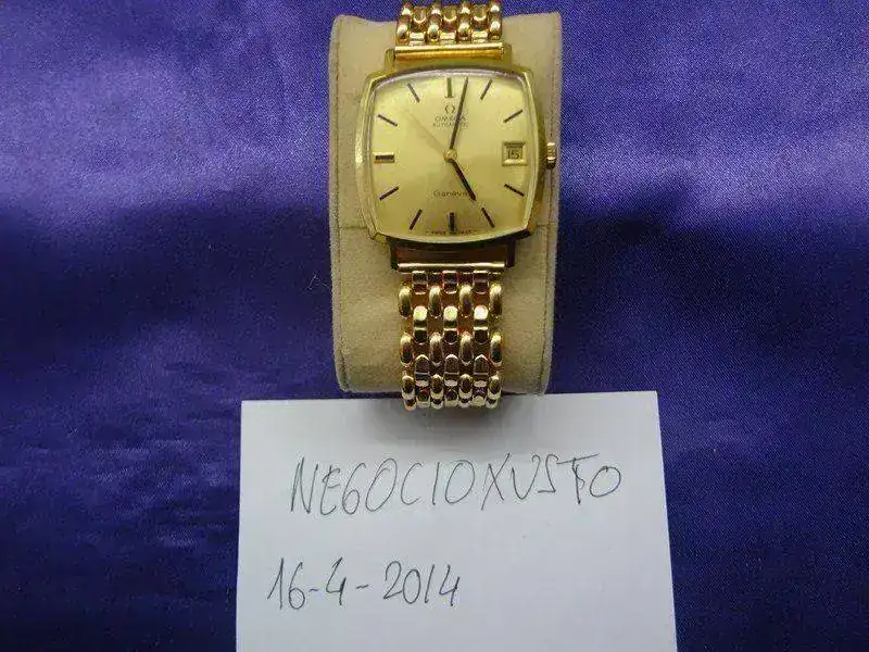 Esfera dorada firmada Omega Geneve, con calendario a las 3. Diales y agujas negras y doradas. En buen estado de conservacion,tiene un ligerisima mancha entre las 11 y las 12.