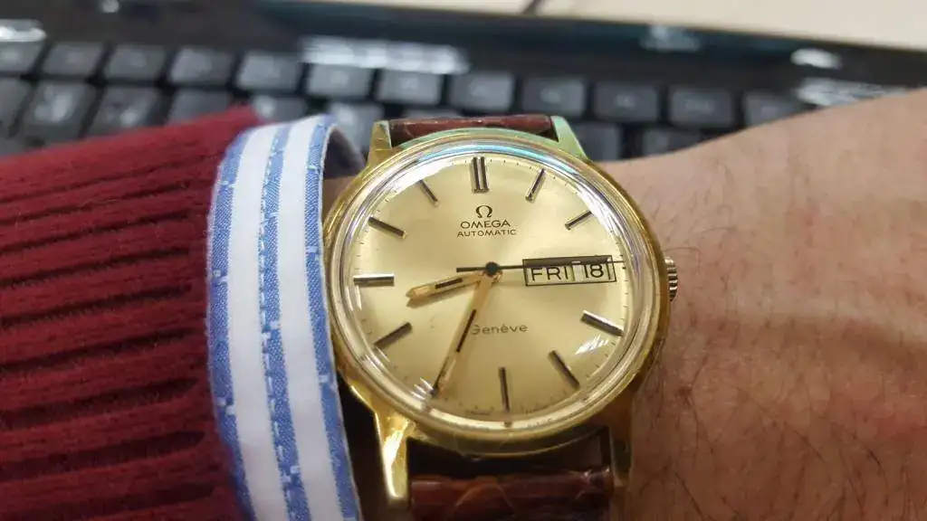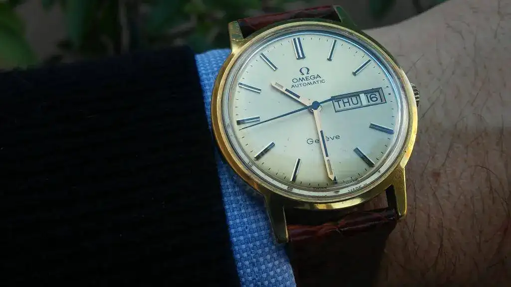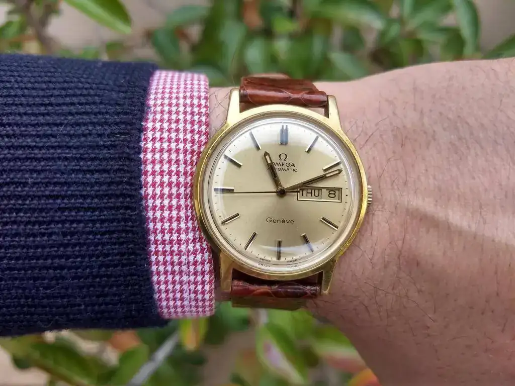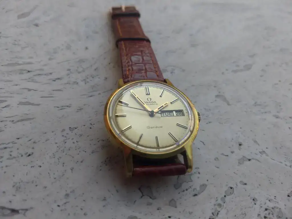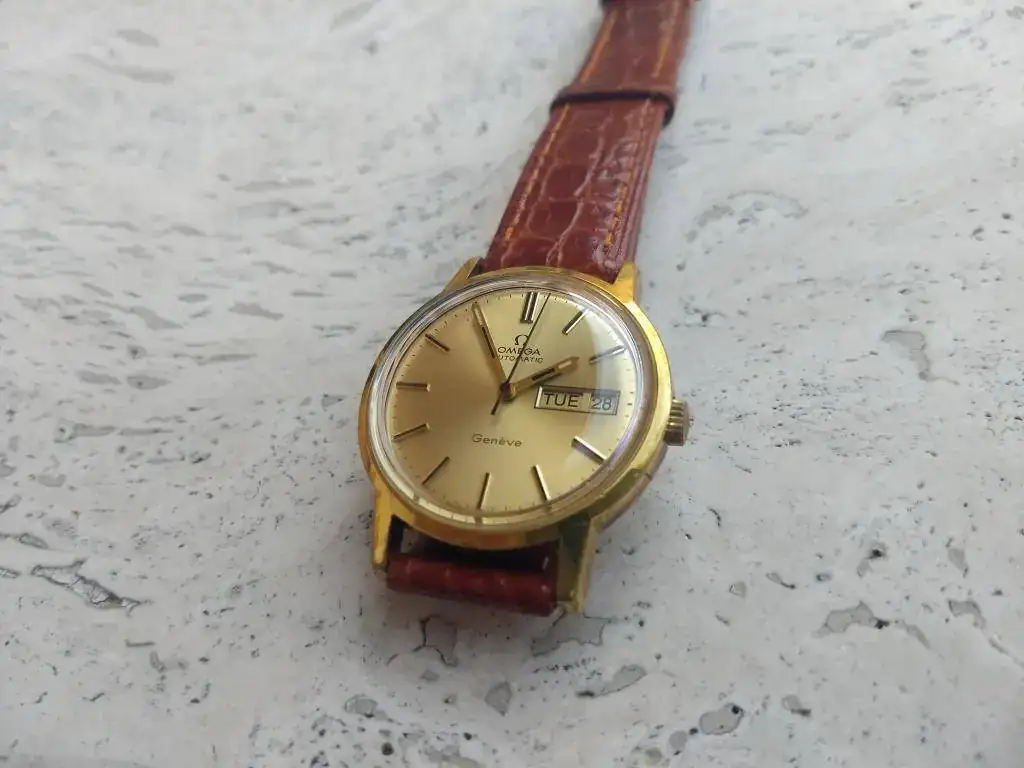 Saco este Genève al que tengo gran cariño por ser el primer Omega que entró en mi caja pero mi colección toma caminos inesperados y ya le ha llegado su hora. Lleva un calibre 1022 en perfecto estado, al cual se le hizo un servicio completo hace tres años y desde entonces lo habré usado no más de 15 veces. Es un calibre automático Day-Date con hacking (detención de segundo) y cambio rápido de fecha.