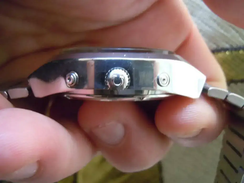 Además, en el lateral de la caja donde se ubica la corona se localizan dos pulsadores, el superior cambia el día del mes, el inferior sirve para procurar avances del segundero, con pulsaciones cortas, y si se mantiene pulsado detiene el segundero para sincronizarlo con una señal horaria.