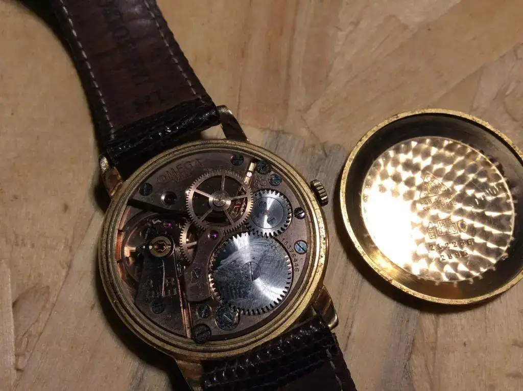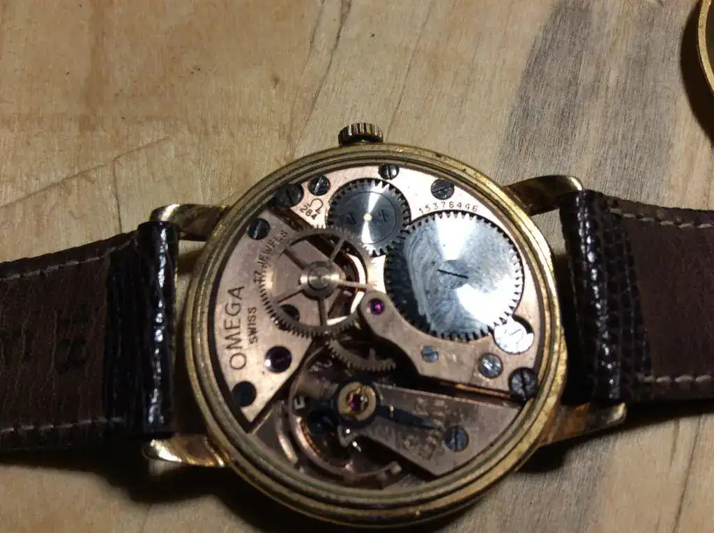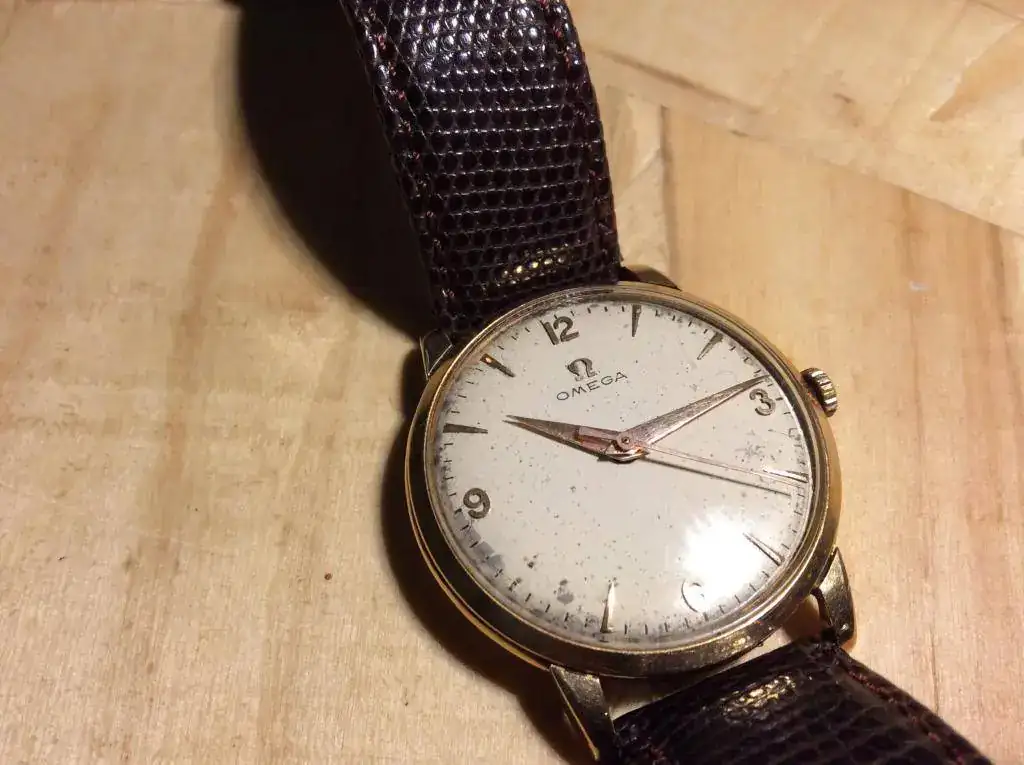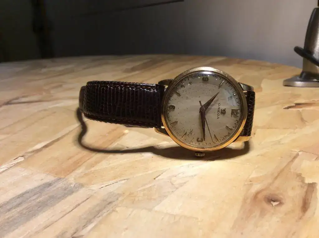 Hace ya unos años herede este reloj Omega (sin modelo, ni "swiss made").el reloj es de oro y por supuesto de cuerda. En su esfera se ve el paso de los años. Su corona no es la original ni la hebilla. El reloj mide 36mm con corona.