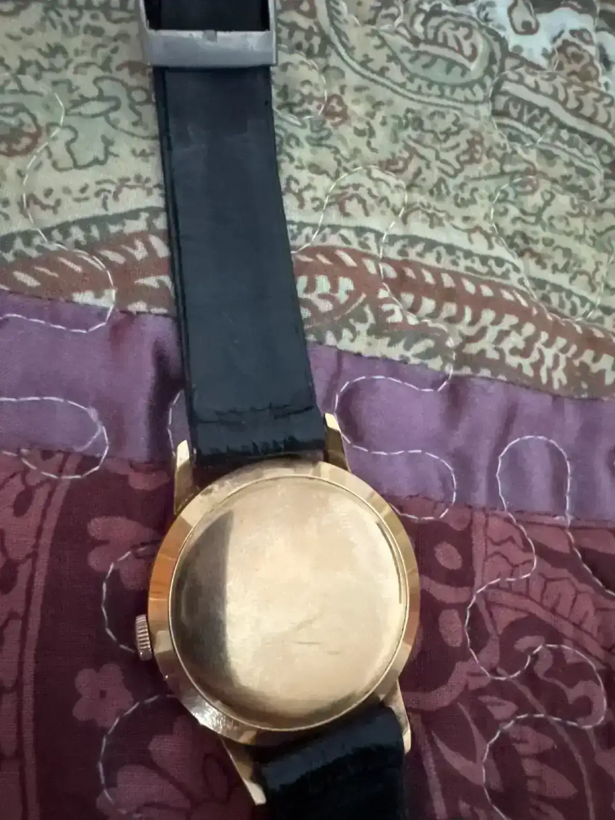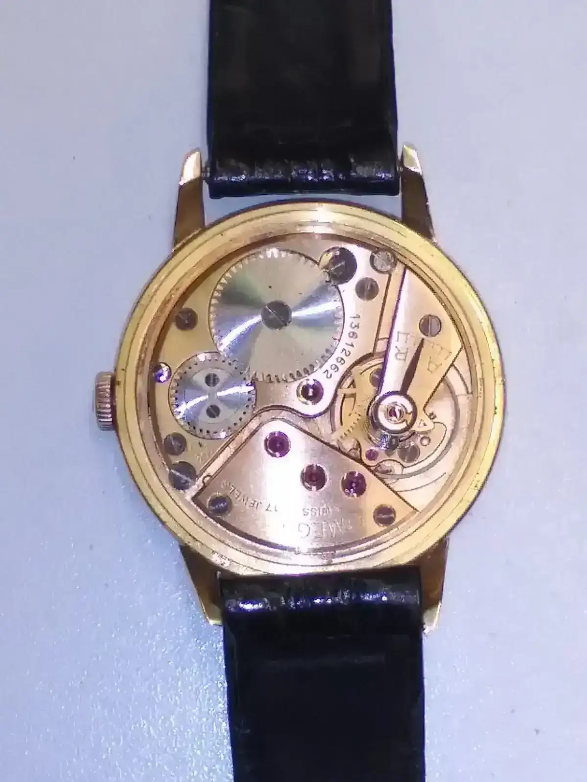 Buenas a todos, acabo de recibir de mis padres este reloj que proviene de mi abuelo. Ella me asegura que es de oro de 18k pero hasta que no lo lleve al relojero a abrir la tapa y ver mecanismo y el grabado interior no lo puedo asegurar, pero si que pudiera ser. Así a simple vista cambiaré el plexiglás e intentaré conseguir el recambio original que he leido que puede conseguirse por unos 60-70€. La corona parece la original y tiene el símbolo de omega. A eso añadirle una correa de jacobstraps lo más fiel a la época y tambié una hebilla de omega para la correa. Aparentemente funciona bien y en la medición hecha en el dia no tiene desfase, pero entiendo que despues de tantos años le vendría bien una revisión, limpieza y aceitado del mecanismo.