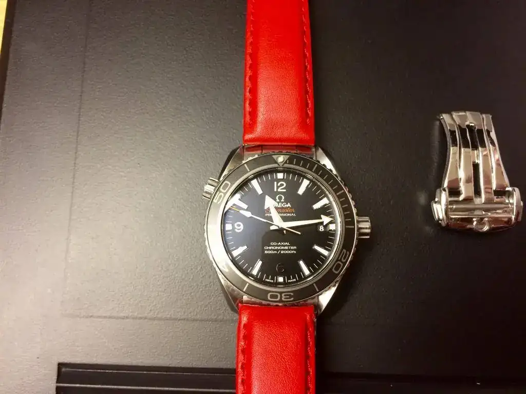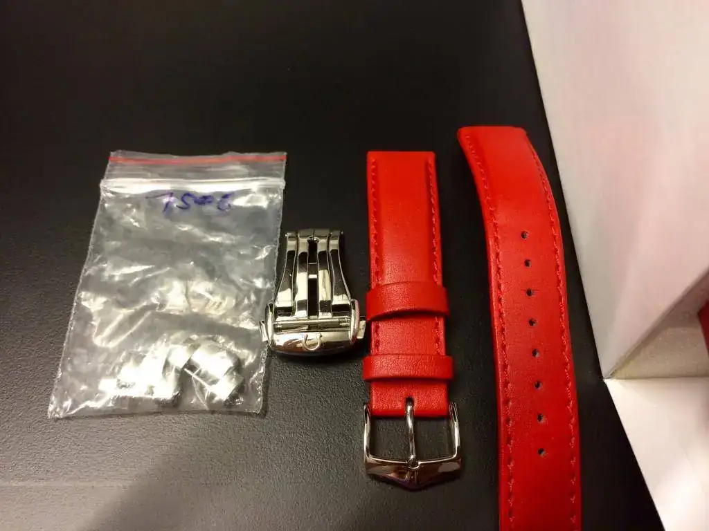 Añado al pack varias cosas: una correa Hirsch de piel roja waterproof que no me va con ningún otro reloj. Tiene unas pocas horas de uso. Y un cierre deplo Omega que no necesito ya que no tengo más Omegas y que valdría para este reloj si le poneis la correa adecuada.