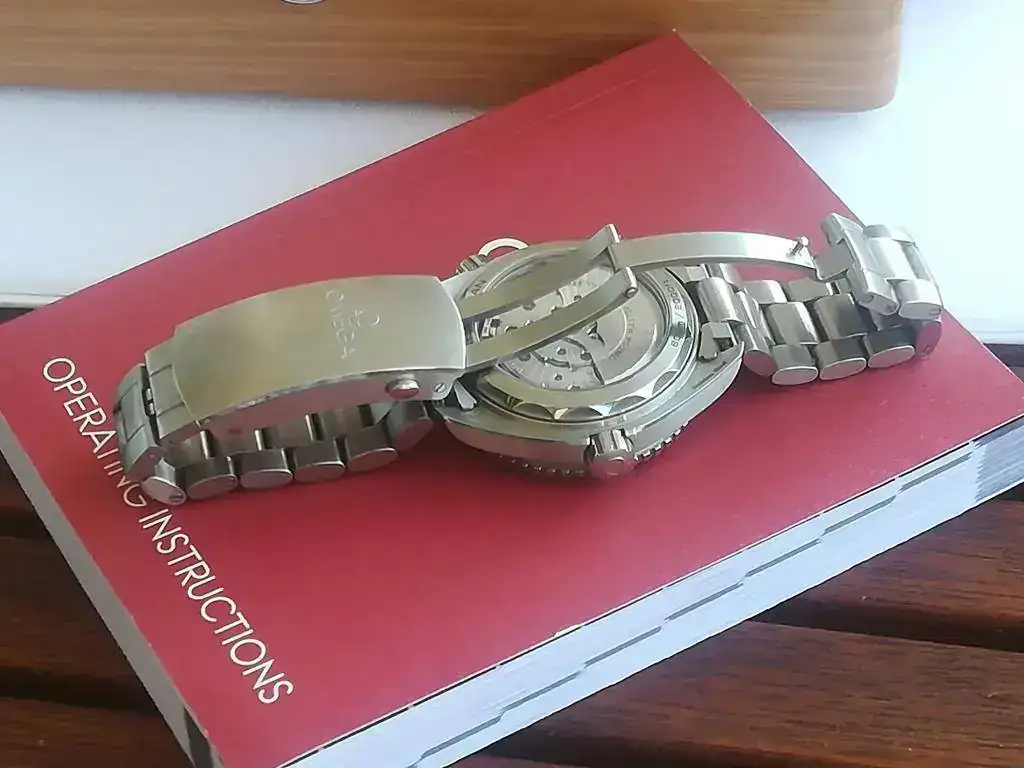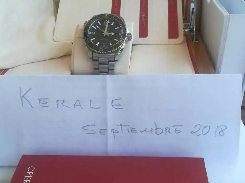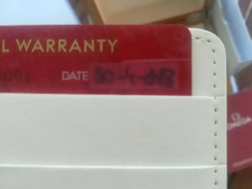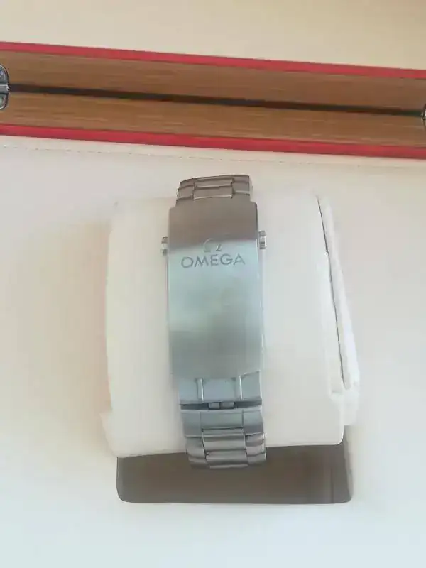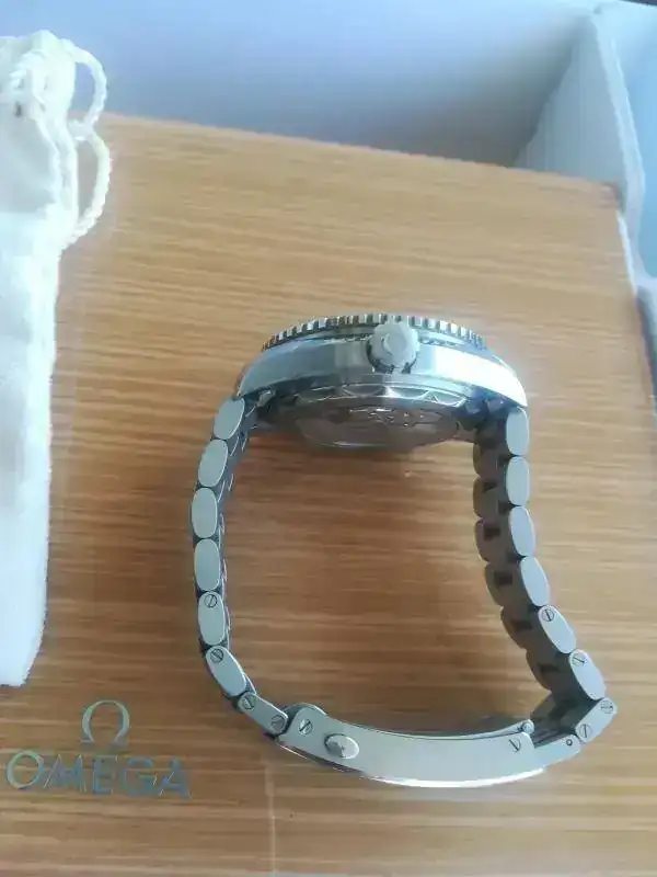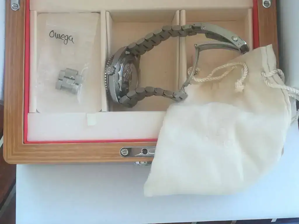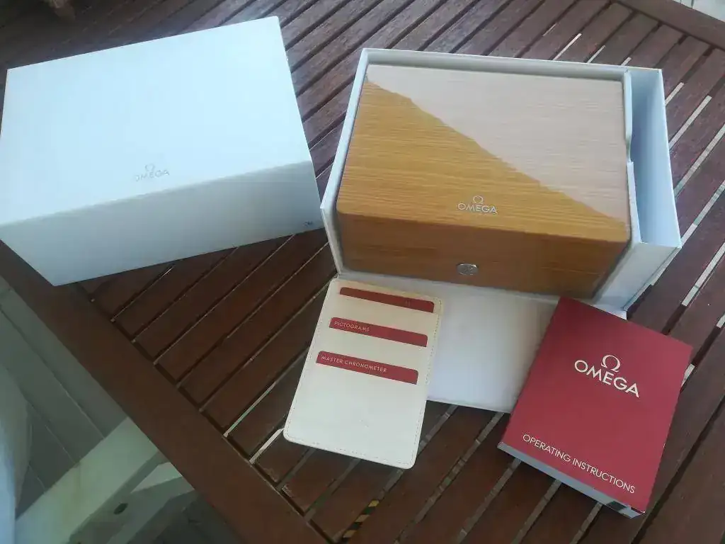 Cuenta con la dotación completa (caja exterior de cartón blanco y caja de madera, manual de instrucciones, eslabones, saco de paño ,tarjeta de garantía, pictogramas y Certificado METAS. Accediendo a la página de Omega se puede introducir el número de dicho certificado y aparecen los resultados del reloj en cada una de las pruebas a las que fue sometido para obtener dicho certificado.