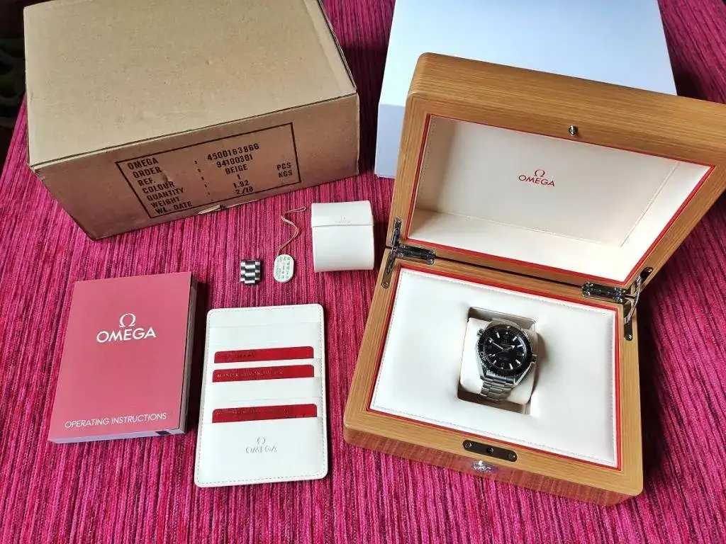 Obviamente se entrega completo y perfecto (nuevo). Caja exterior de la exterior de transporte de cartón, la blanca exterior, la de madera maciza (preciosa), manual, tarjetas, garantía sellada, sello Omega, eslabones sobrantes, bolsita o saquito de transporte que entregan con los relojes...
