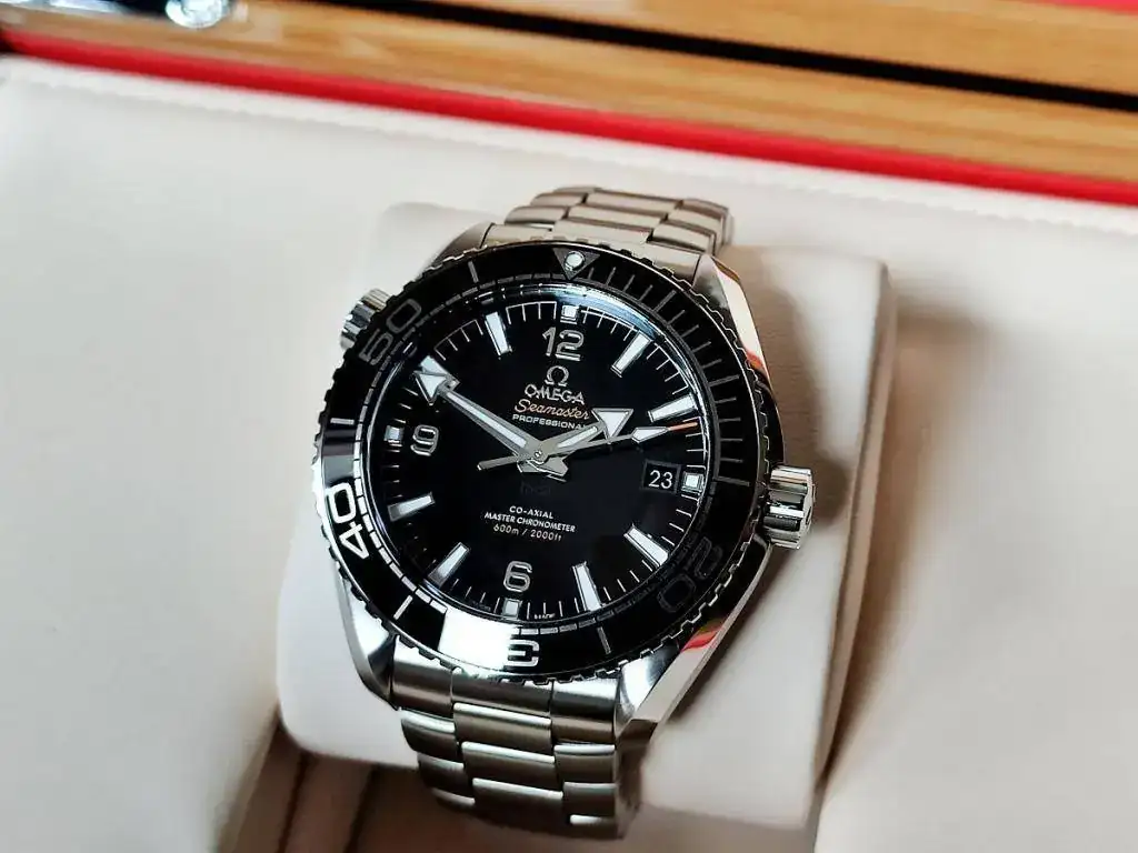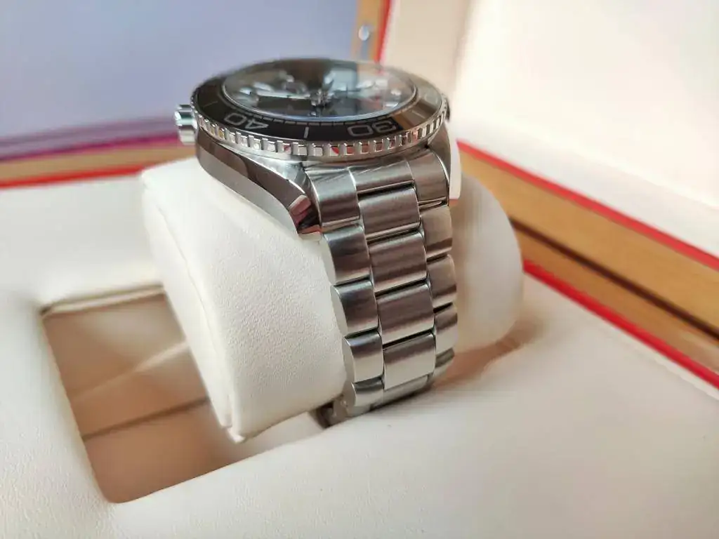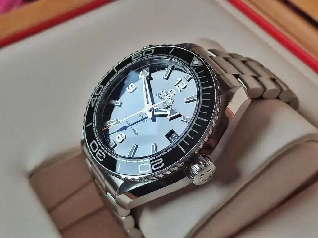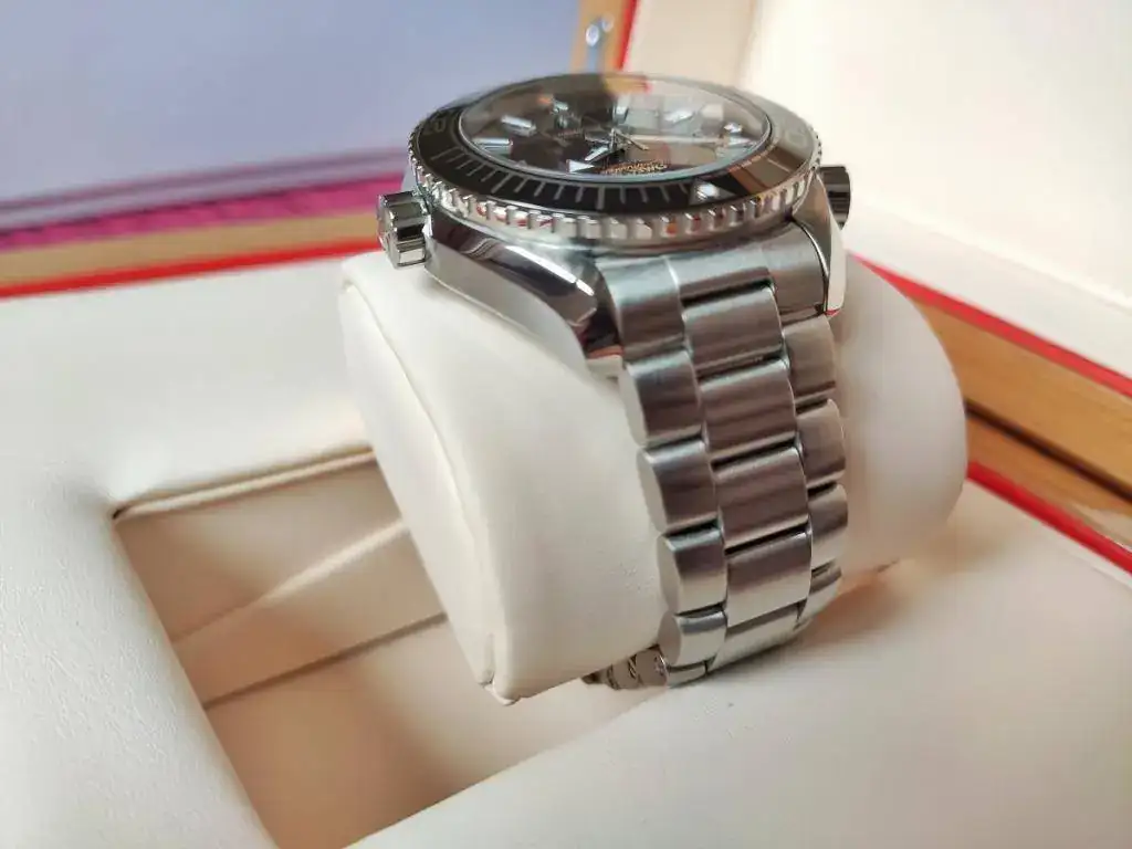 Se trata de un Omega Seamaster Planet Ocean nuevo, calibre 8900 con certificado METAS (lo que he comprobado es que está en CERO segundos al día), tamaño de 43,5 mm de caja pero que puesto, el lug to lug es de 48 mm como el 42 anterior de calibre 8500, lo que sumado al cambio de tipo de enlace del armis a la caja, que ahora es "hembra" y hacia abajo y no "macho" y recto, hacen que ajuste mejor a la muñeca que el modelo anterior.