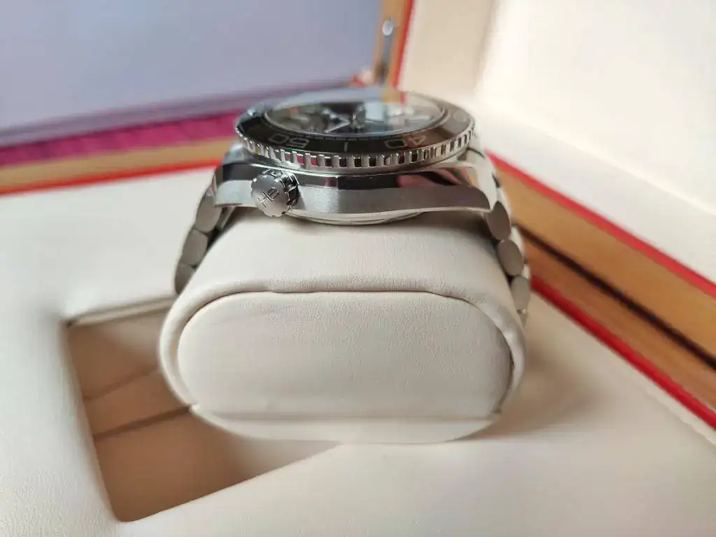 Tanto la esfera como el bisel (y no solo el bisel) son de cerámica negra, impresionantes, sumergible 600 metros, coronas a rosca... y un punto importante, trae el cierre con micro ajuste de 6 posiciones más extensión de buceo. Estos cierres los tengo en otros modelos y son fantásticos por la precisión de ajuste y la rapidez en esos momentos que aprieta un poco o queda un pelín holgado.