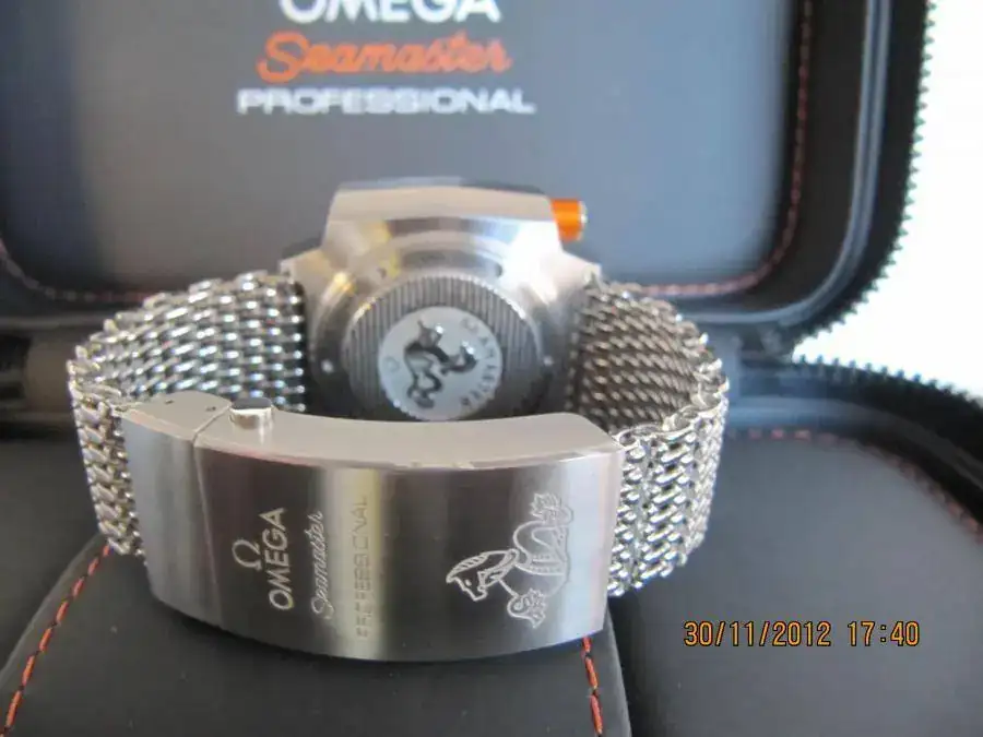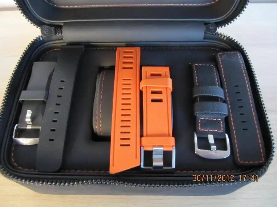 El reloj lo entrego con su espectacular milanesa, una correa naranja Isofrane, una Maratac de tela de barco con presunte naranja y una correa de caucho negra estandard. Solo el reloj con la milanesa alcanza 7100 euros.