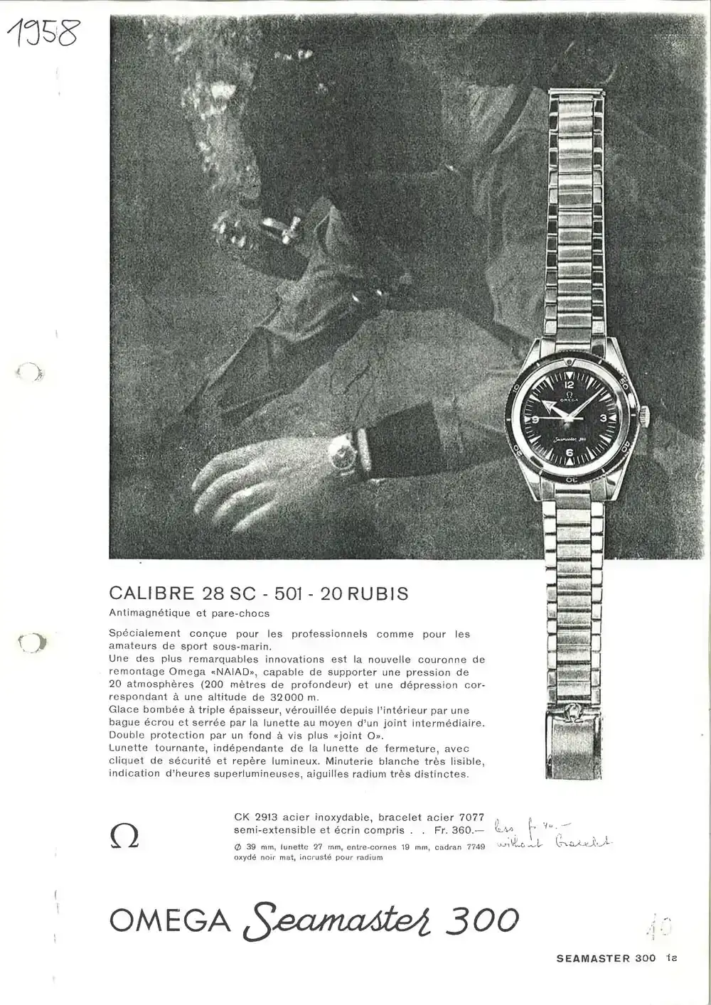 Lo único es que, aunque fuesen sumergibles (entre sus pruebas se encontraba una inmersión de 72 horas a diferentes presiones y temperaturas) no eran relojes se submarinismo al uso. Y eso cambió en 1957 con la aparición de esta nueva línea Seamaster con el pack completo de diver: bisel giratorio, índices luminiscentes, nuevas agujas que mejorar la legibilidad, etc.