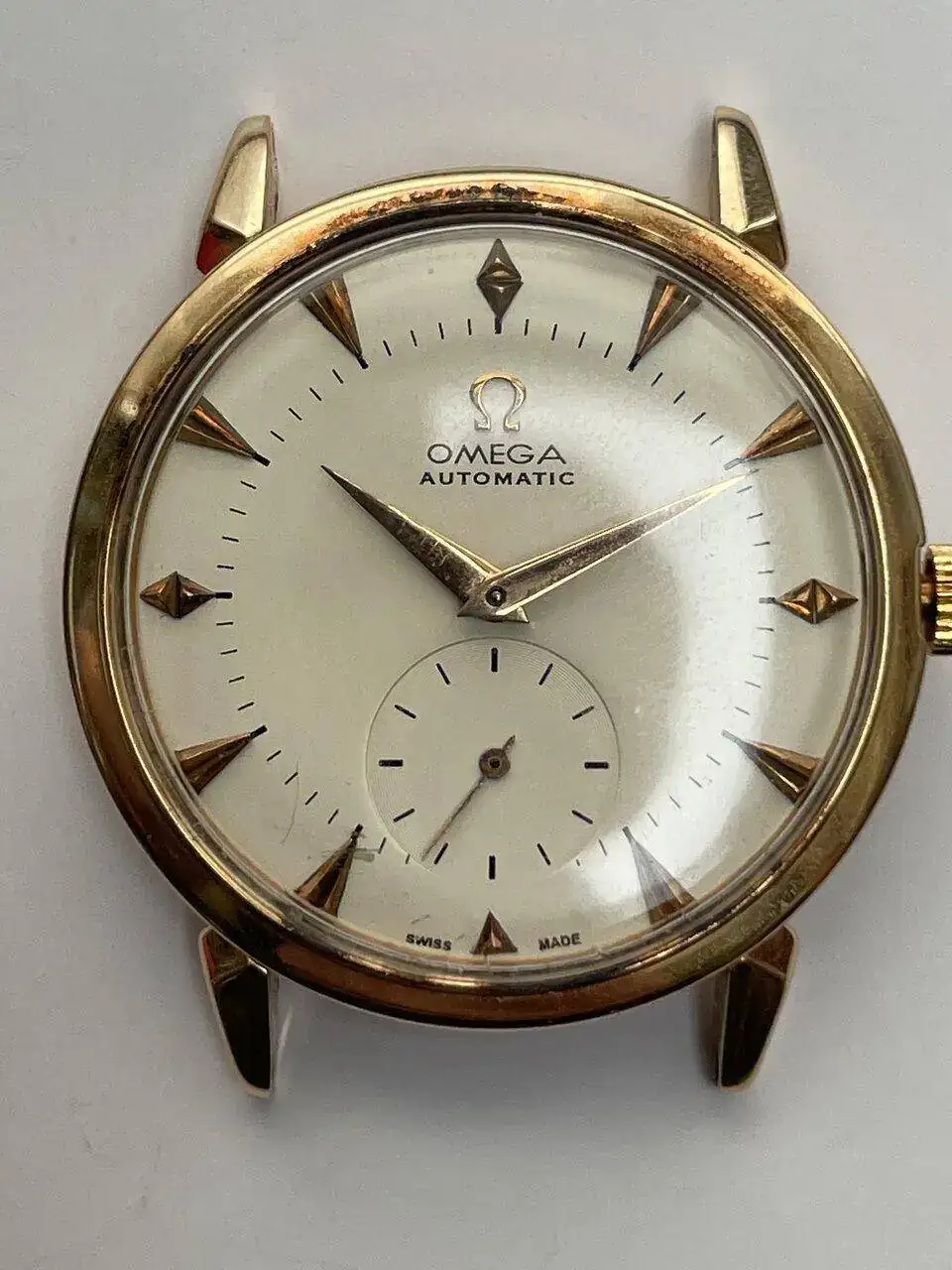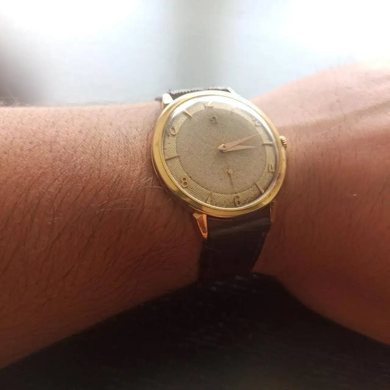 Se trata de este Omega , que fue de mi suegro. El reloj está en un estado óptimo con la esfera supongo que nunca restaurada -mi suegro falleció hace casi treinta años -