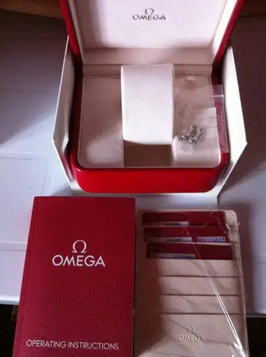 El reloj se vende con su set completo, incluyendo caja original Omega en color blanco, caja de piel de color rojo, tarjeta identificativas de pictogramas, tarjeta de garantía, tarjeta acreditativa certificado chronometer y libro de instrucciones.