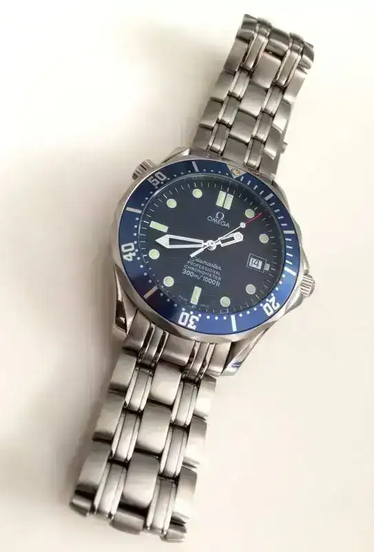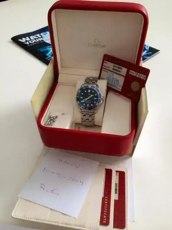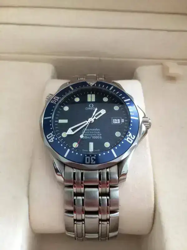 Pues como reza el título cambió un omega seamaster Bond azul no coaxial automático. El reloj esta recién revisado y pulido en C.O. Omega (Rabat) con cambio de juntas, engrasado, corona nueva y estanqueidad, todo ello con garantía de un año. Solo reseñable algún muy leve pelo en el bisel ya que decidí mantener el original con su correspondiente decoloración.