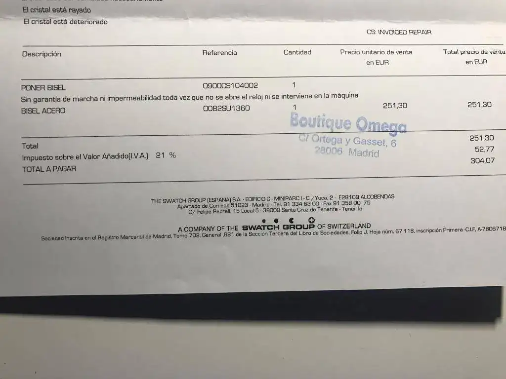 Factura de cambio de bisel en Omega de Ortega y Gasset.[/TD]
