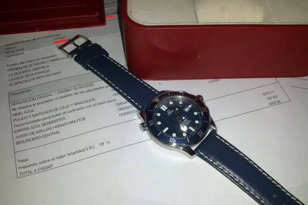 Basándome en el precio de uno similar hace meses le fijo un precio de 1000 euros.El reloj se entrega como se presenta en las fotos,con una correa genérica azul nueva a estrenar.Dispongo del armix original recientemente pulido por un sobreprecio a convenir.Como se puede apreciar por las fotos, pasó por servicio técnico oficial en la que se cambió bisel,esfera,agujas además de la revisión completa de cuarzo y pulido.Se encuentra en buen estado y conserva el punto de lacre azul de Omega.Daré prioridad a los mensajes por orden de llegada y no puedo aceptar cambios en esta venta.