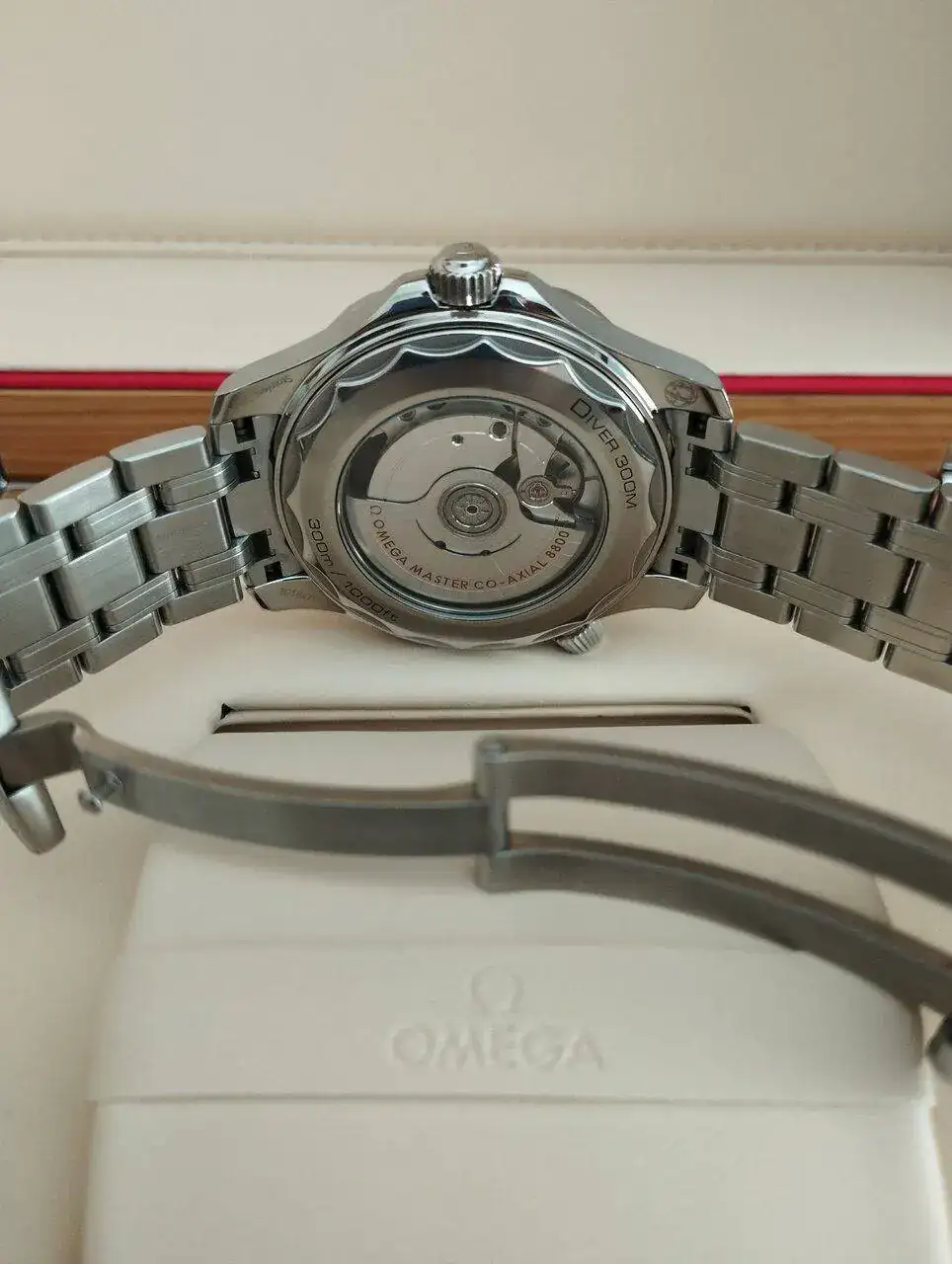 Al abrirla nos encontramos con el reloj centrado con una tapa la cual se levanta y tiene compartimentos para eslabones y una bolsita.