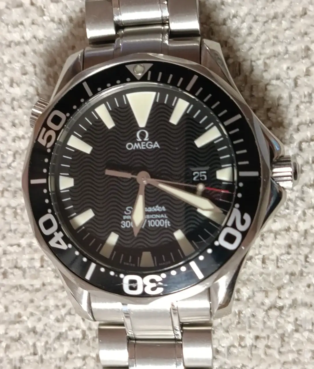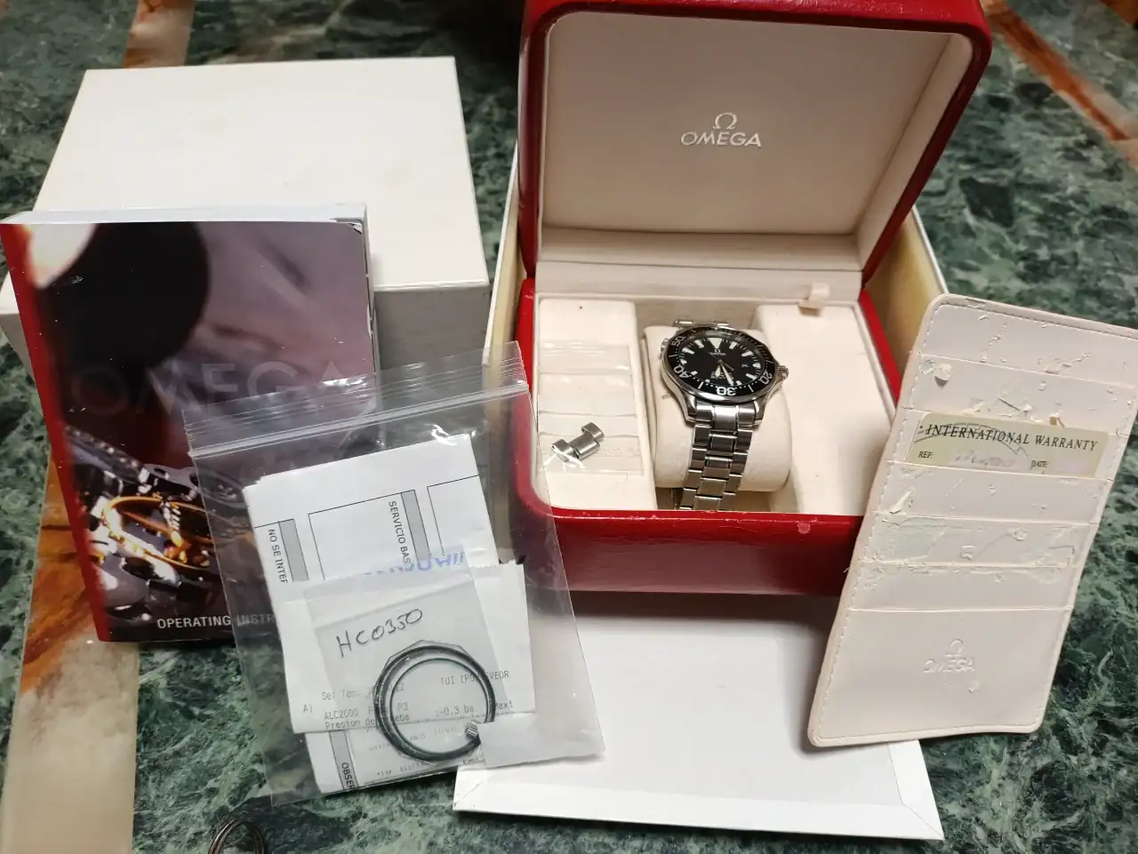 Pongo a la venta este Omega Seamaster Diver 300m conocido como "El Negrito" full set, movimiento de cuarzo, en un estado estético bastante bueno diria yo, salvo un pequeño arañazo en el insert del bisel a la altura del numero 30, cristal impoluto, cambio de pila y estanqueidad con cambio de juntas y corona realizado en Noviembre de 2023. El reloj está completo de dotacion y documentacion, el tarjetero, como la mayoria, un poco deteriorado, la fecha de compra se ha borrado debido al paso del tiempo pero se ve claramente el numero de serie y referencia Omega, ya lo compré asi a un gran compañero del foro por lo que le pongo el mismo precio que yo pagué por él.