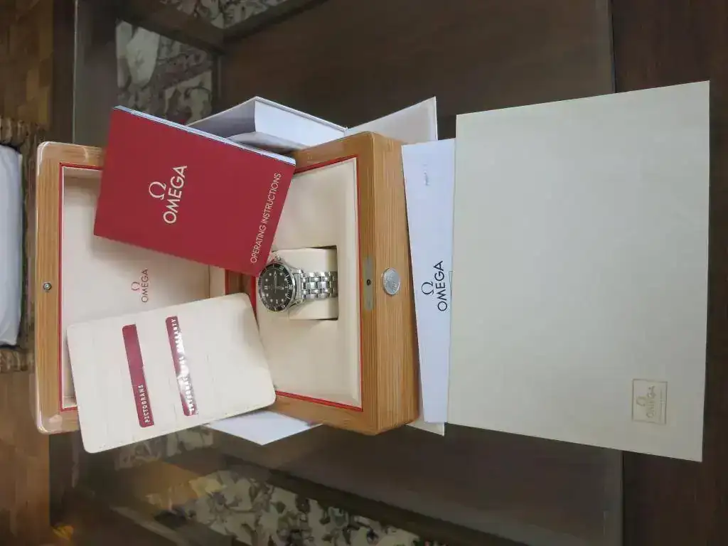 El set incluye el reloj, la factura del cambio de pila, varios pasadores y cilindros originales de Omega por si se perdiera alguno al poner/quitar algún eslabón, manual de instrucciones, tarjeta de garantía, tarjeta de pictogramas, tarjetero Omega,caja de madera barnizada Omega y caja exterior de cartón blanca. Todo impoluto.