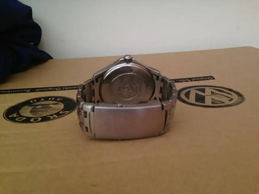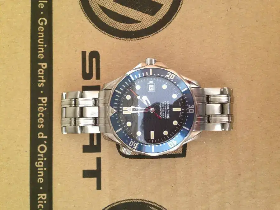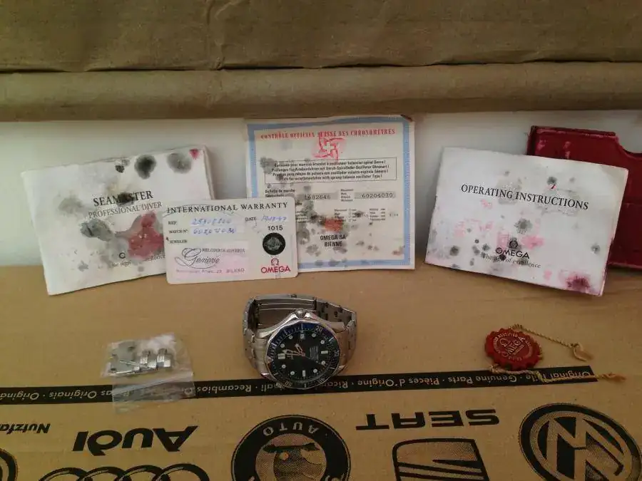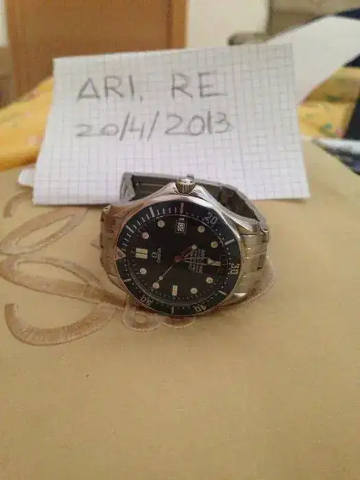 Saco para venta este magnifico Omega Seamaster del año 98. Esta en muy buen estado, salvo por alguna marca en el bisel que se puede apreciar en las fotos (bisel que por cierto ha adquirido un precioso tono azul degradado), y minimas marcas de uso. El armis no presenta holgura. No dispongo de caja pero si de documentacion, aunque, tal y como se ve en las fotos, esta en mal estado (exceptuando la tarjeta) ya que sufrio los efectos de una reciente inundacion de mi casa (la caja no pudo salvarse). Le pongo un precio de 1000€ sin envio. Ahora, las fotos: