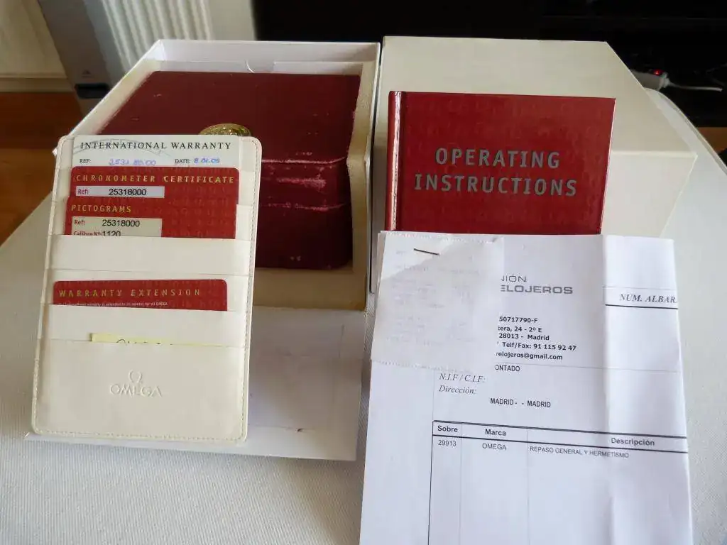 Dispone de toda la documentación, tarjetero, tarjeta de identificación del movimiento, tarjeta de identificación con el número del reloj, tarjeta de garantía caducada, libro de instrucciones, sus 2 cajas originales la blanca de cartón y la roja, que esta algo desgastada por el roce con la blanca y el paso del tiempo, y eslabones sobrantes.