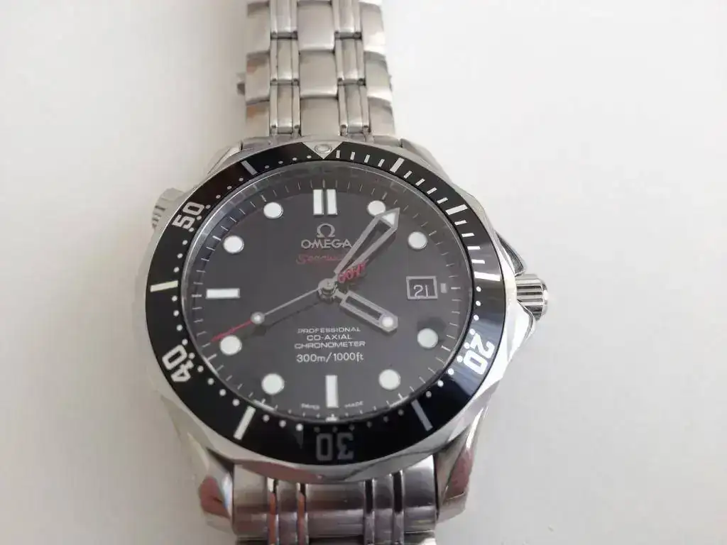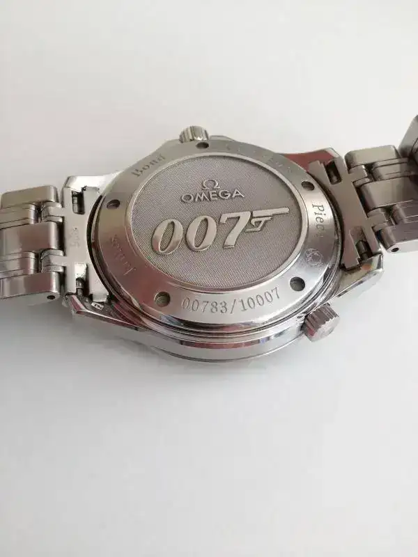 Lleva esfera negra y bisel negro y las siglas 007 en el segundero en rojo.