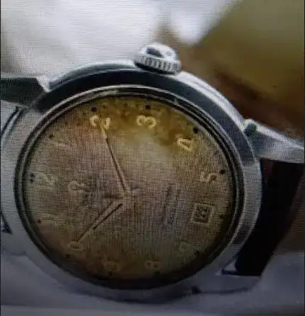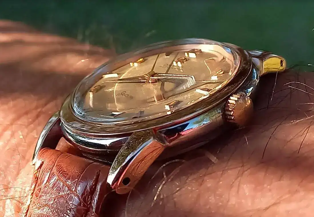 La esfera es la original y no está repintada. Lleva números, índices y agujas doradas en oro rojo. Depende de la luz la esfera se presenta en un blanco huevo hasta un blanco tirando a más oscuro, lo que es la pátina de 70 años.