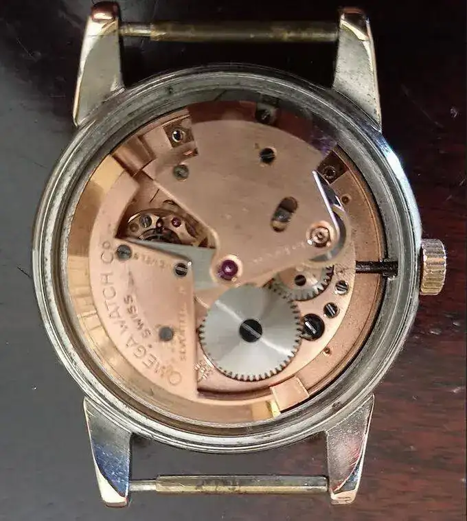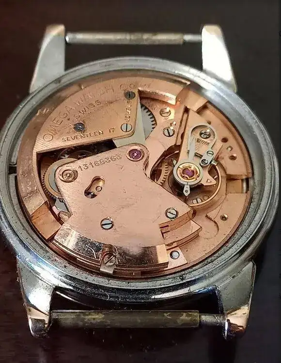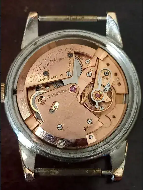 Típico puentes de Omega chapados en oro rojo, volante con tornillos que gira con 19.800 alternacias, no con 18.000 como era normal en los cincuenta.