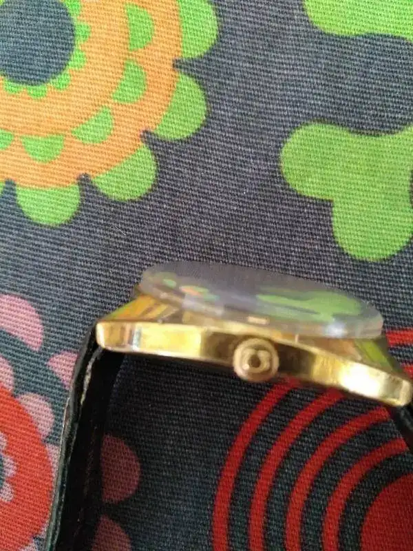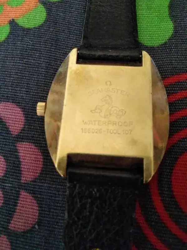Caja dorada monoblock, corona Omega dorada y correa de cuero negra con hebilla dorada nueva.: