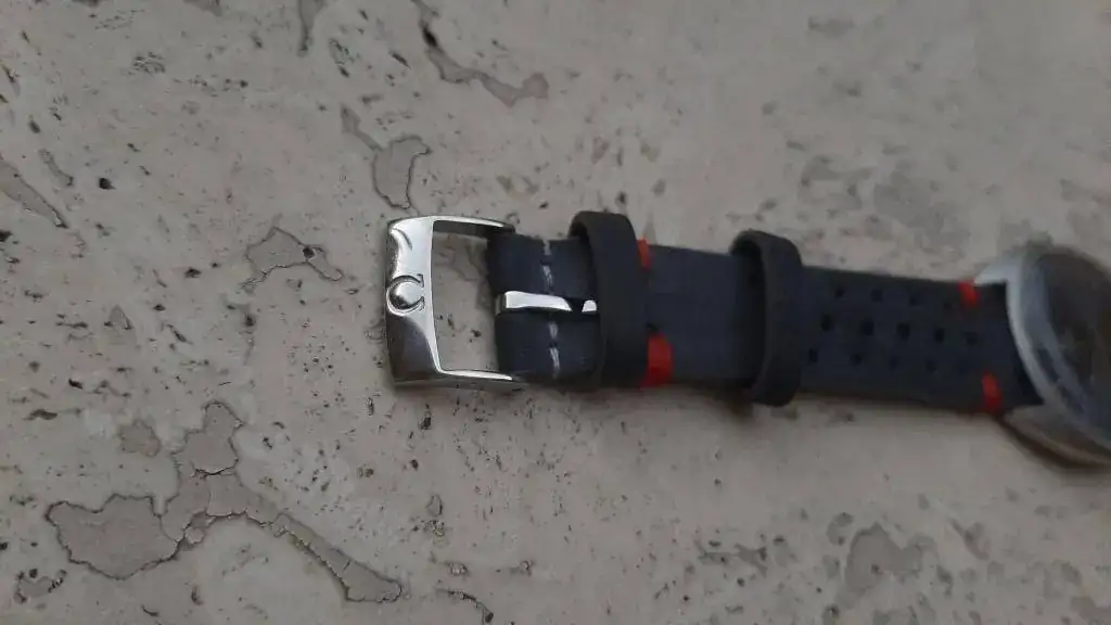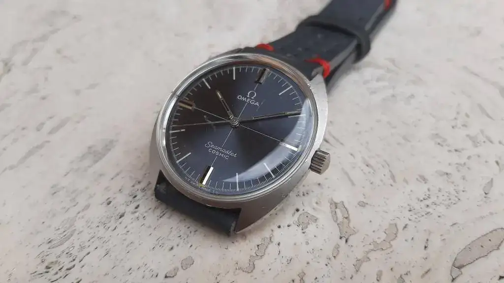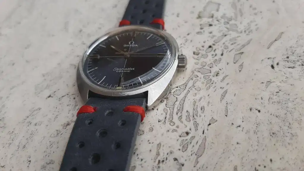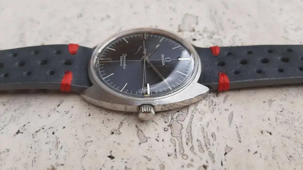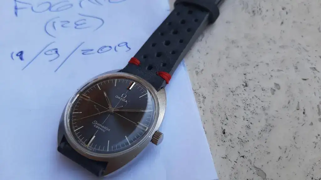 Esfera con "Cross Hair", color azul marino, aunque según la luz puede parecer marrón oscuro o negra. Caja monoblock de acero de 35 mm en excelente estado original sin pulir, la versión grande de la serie COSMIC. Plexi original firmado Ω. Se entrega con correa artesana nueva y hebilla firmada Ω (no es la del modelo)