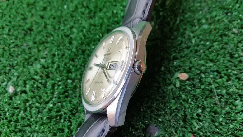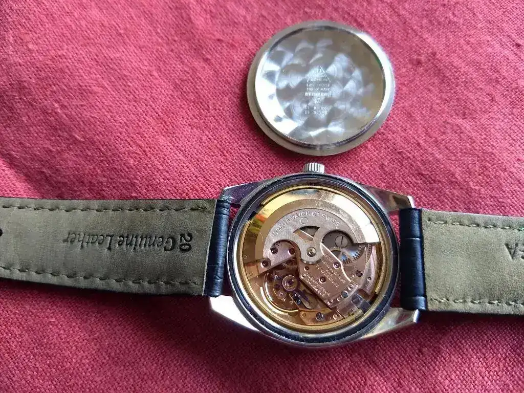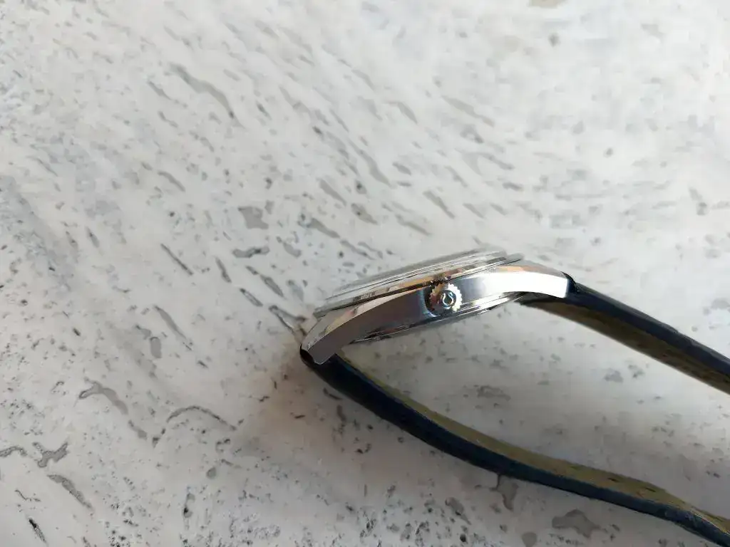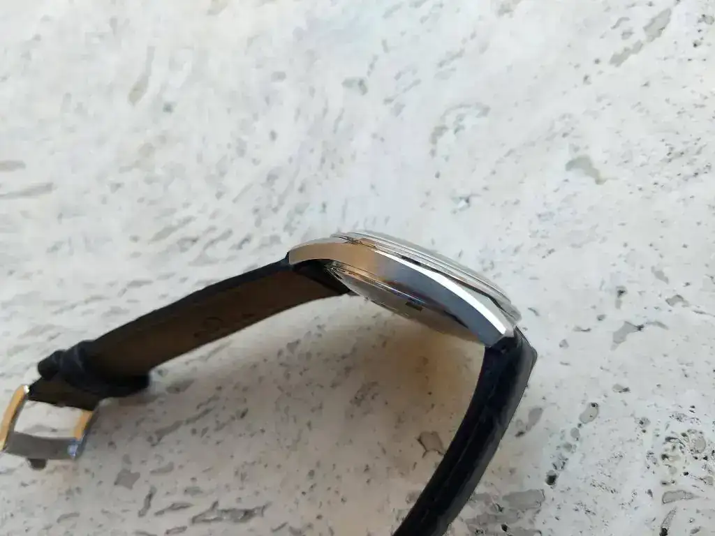 La caja de acero es grande para la época (36 mm), nunca ha sido pulida y conserva su acabado original cepillado en frontal y lateral y pulido espejo en la arista oblicua de la caja y el lateral del bisel. No descarto que la trasera se haya pulido alguna vez. La esfera, con el marcaje completo de los cronómetros, tiene algunas señales de la edad que se aprecian en las fotos, nada escandaloso o que moleste a la vista en muñeca.