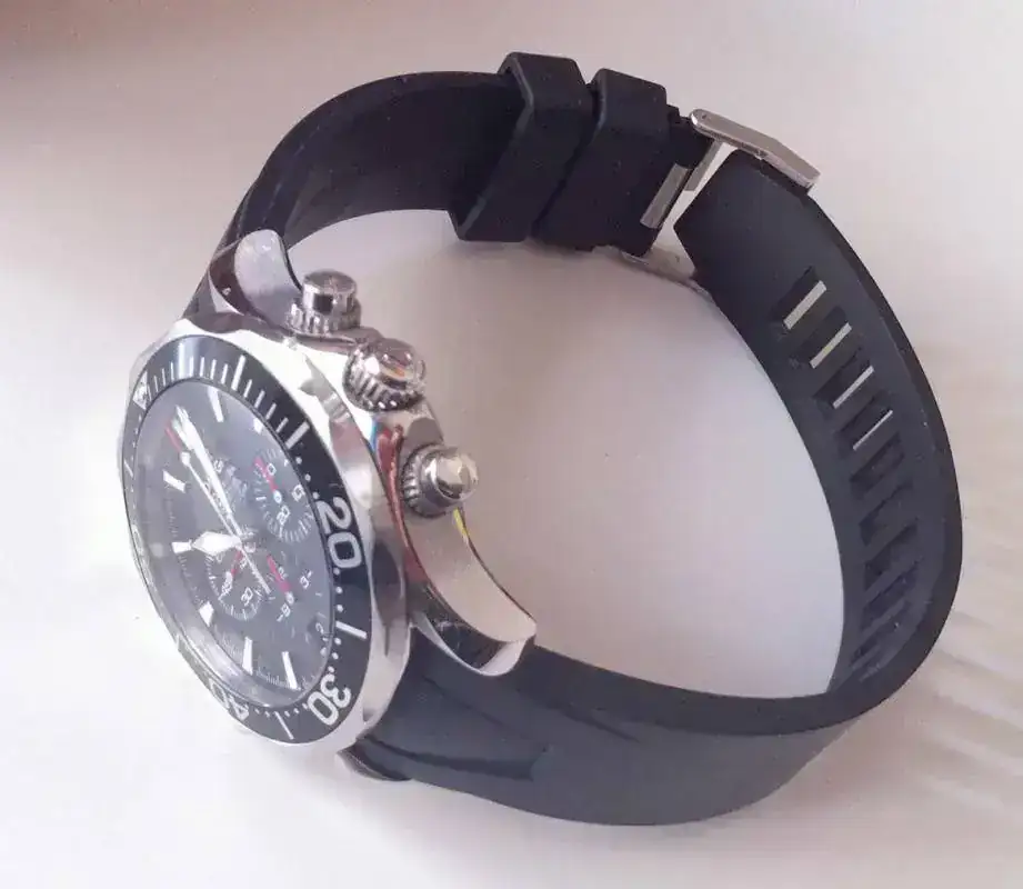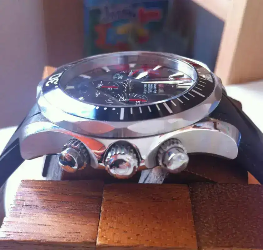 Funciones: Segundero en la sub esfera de las 9, contador de minutos del crono a las 3, contador de horas del crono a las 6 y fehador a las 6