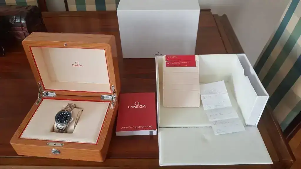 Dotación completa con la caja de madera, la exterior blanca, todos los eslabones, tarjetas rojas. Tengo hasta la factura original de compra en el Duty Free de Dubai.
