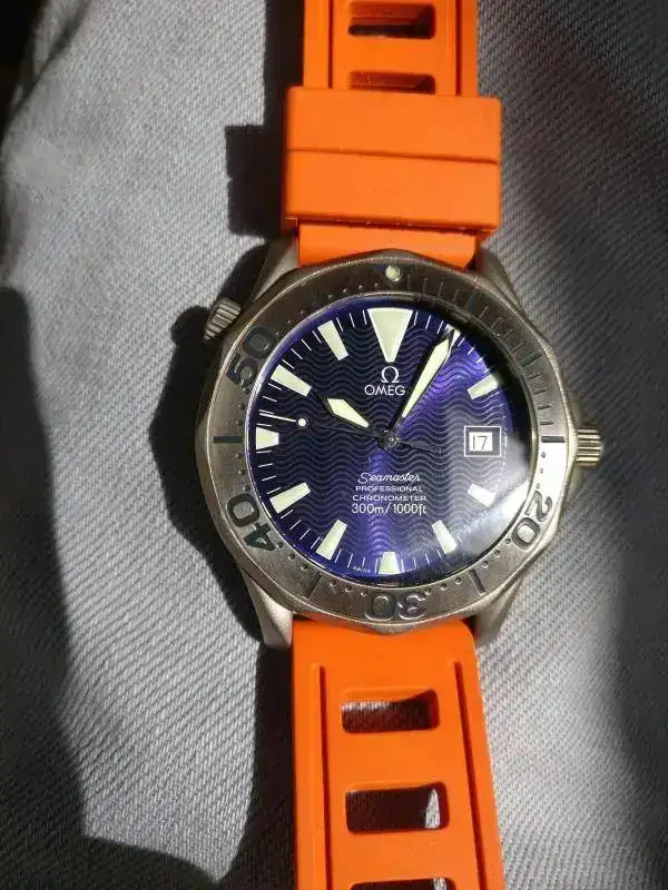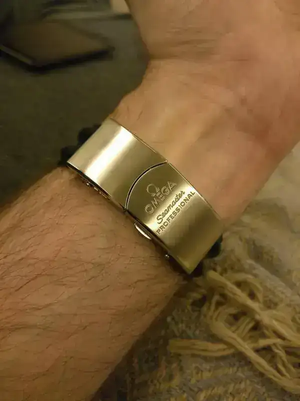Correa de caucho omega bastante especial. Es de caucho azul oscura (bastante oscura) y está al 99,9%. La estrene yo hace apenas 2 meses y la he usado 3 veces. Lleva un cierre desplegable Omega Diver muy contundente. Es de mariposa accionada por pulsadores y tiene además ajuste micrómetrico rápido a ambos lados de la correa. Válido para muñecas de 16,5 a 18.