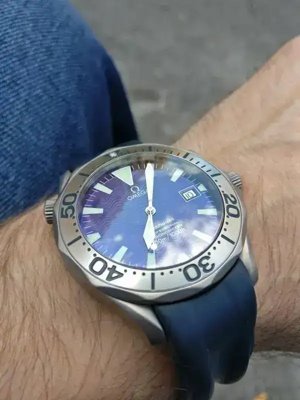 Es el modelo de titanio con esfera azul mar oscuro. Dependiendo de la luz toma diferentes azules oscuros. Su estado es muy, muy bueno.